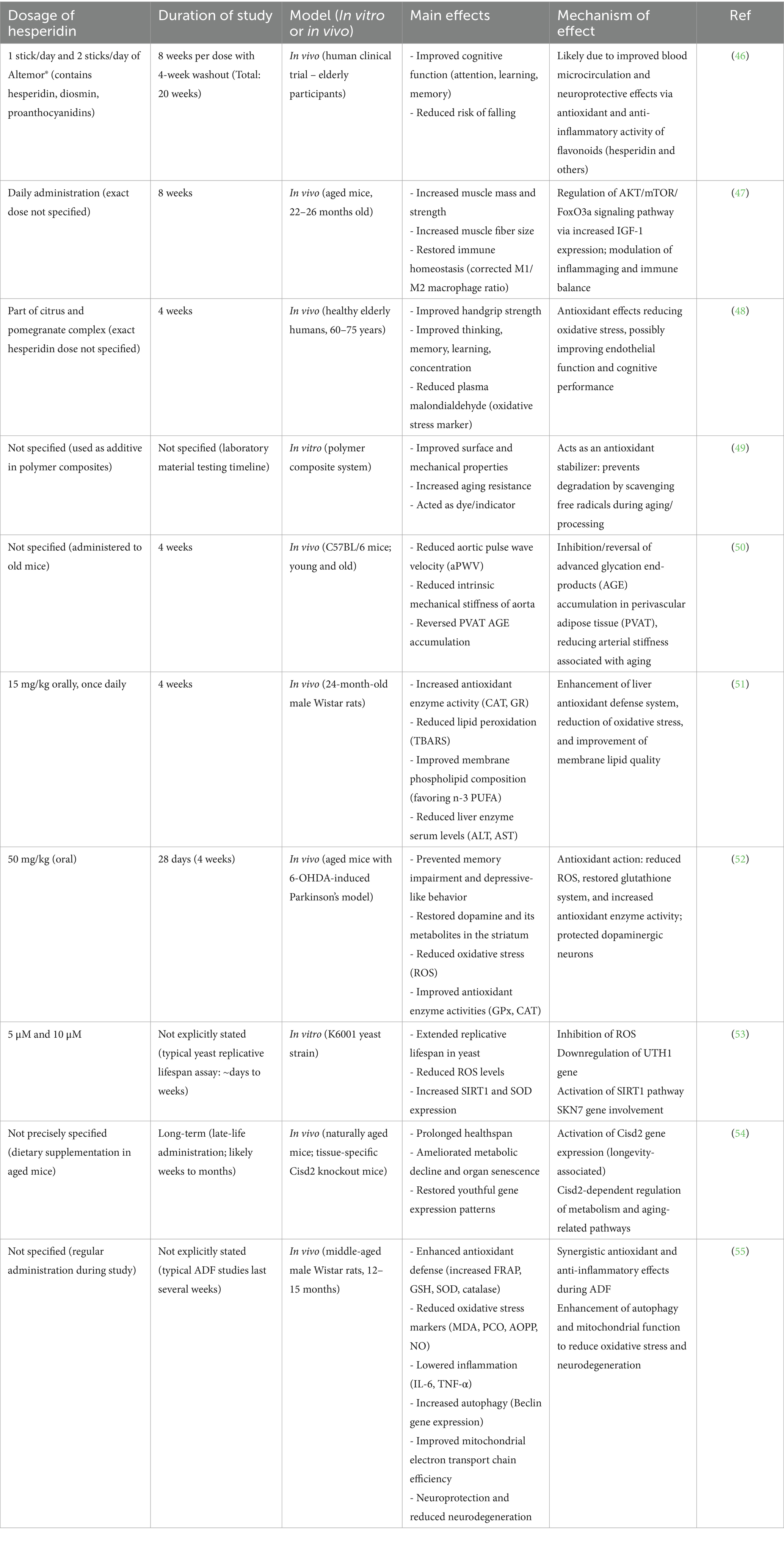 The investigation examined the role of hesperetin (HST) as an activator of the longevity-associated gene Cisd2. In senescent mice, the administration of dietary HST resulted in an upregulation of Cisd2 expression, an extension of healthspan, and an amelioration of age-related metabolic and organ deterioration. The observed anti-aging effects appeared to be contingent upon Cisd2, with the treated mice demonstrating a gene expression profile indicative of a more youthful state. These findings imply that HST may represent a viable strategy for decelerating the aging process and enhancing longevity through the activation of Cisd2 (54). A research examined the neuroprotective properties of HSP supplementation in conjunction with alternate day fasting (ADF) in middle-aged rats. The group of rats subjected to ADF with HSP demonstrated enhanced antioxidant defenses, diminished oxidative stress and inflammation, improved mitochondrial functionality, and superior brain tissue integrity relative to the control group. Furthermore, this combination resulted in an increase in autophagy gene expression, which contributes to the protection of neurons from aging-associated damage. These results indicate that the combination of HSP and ADF might synergistically mitigate oxidative stress and neurodegeneration, thereby potentially decreasing the risks of metabolic and cognitive decline associated with aging (55).