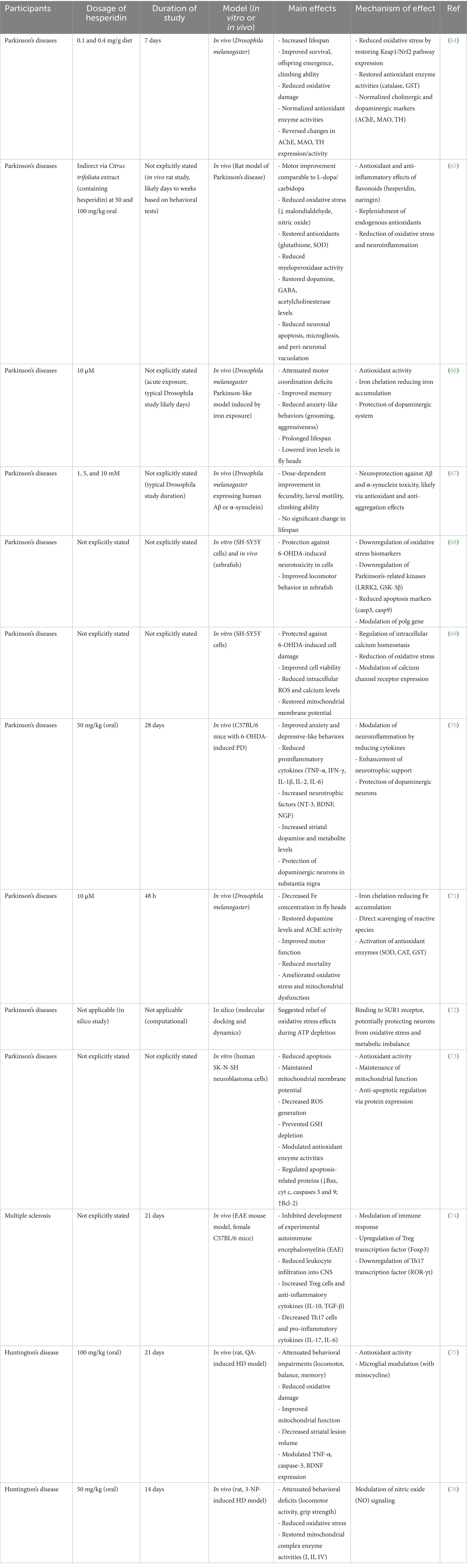 Table 3. The beneficial effects of hesperidin on brain health in Parkinson’s diseases, multiple sclerosis, and Huntington’s disease.