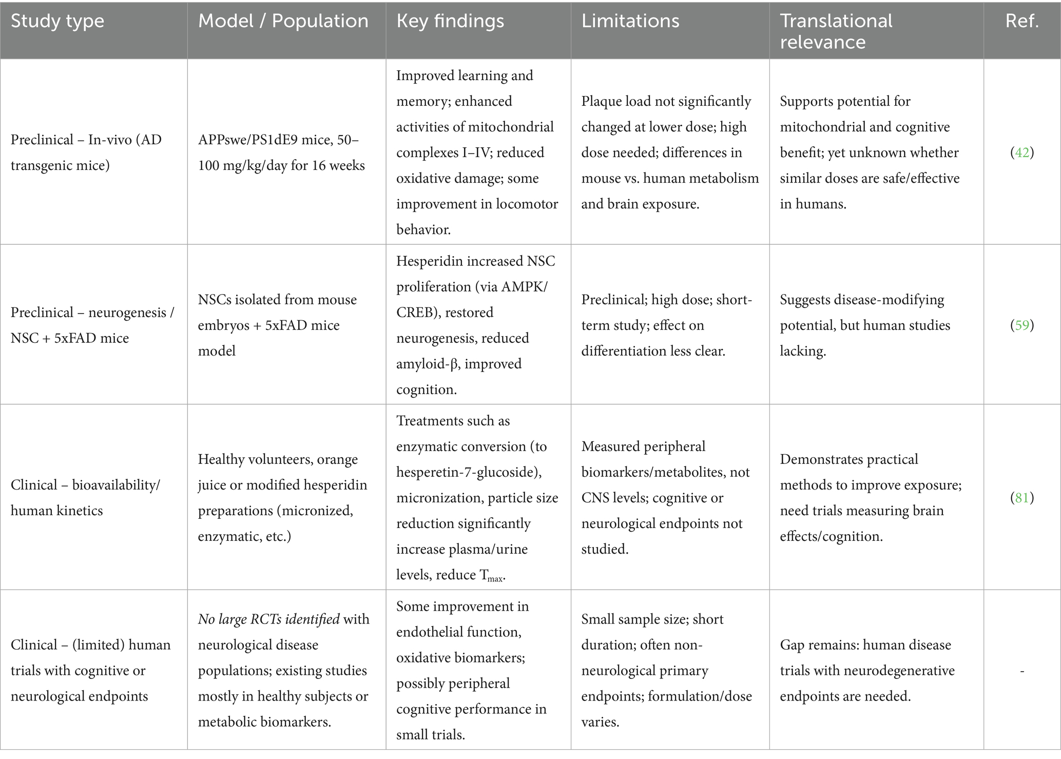 Table 4. Comparative summary of preclinical vs. clinical evidence on hesperidin’s neuroprotective effects.