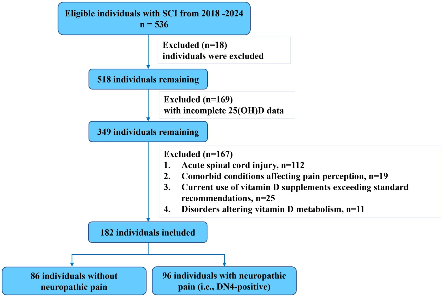 This cross-sectional study was conducted and reported in accordance with the Strengthening the Reporting of Observational Studies in Epidemiology (STROBE) guidelines. The study retrospectively enrolled consecutive adults (aged 18–85 years) with chronic traumatic SCI (injury duration ≥6 months; neurological levels C2–L2; AIS grades A–D) who were admitted to two tertiary rehabilitation centers specializing in acute traumatic SCI between January 2018 and February 2024. Ethical approval was granted by the local institutional review board with a waiver of informed consent. Exclusion criteria included individuals with (1) acute spinal cord injury; (2) comorbid conditions affecting pain perception peripheral neuropathy, diabetes mellitus, malignancy, or severe spasticity (Ashworth grade 3 or higher); (3) current use of vitamin D supplements exceeding standard recommendations (>10,000 IU/day); (4) disorders altering vitamin D metabolism (e.g., hyperparathyroidism and renal failure); or (5) significant psychological comorbidities (e.g., major depressive disorder and severe anxiety) documented in their medical record that could significantly influence pain perception or reporting.