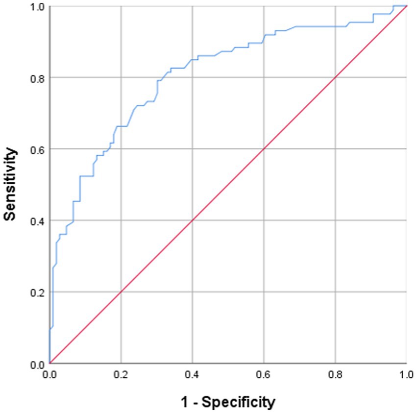 Figure 2. Receiver operating characteristics (ROC) analysis over 25(OH)D levels shows threshold values with specificity and sensitivity in predicting neuropathic pain, AUC = 0.812 [95% confidence interval (CI): 74.9–87.6; sensitivity = 79.1%; specificity = 71.9%] with a cutoff value of 16.35 ng/mL.