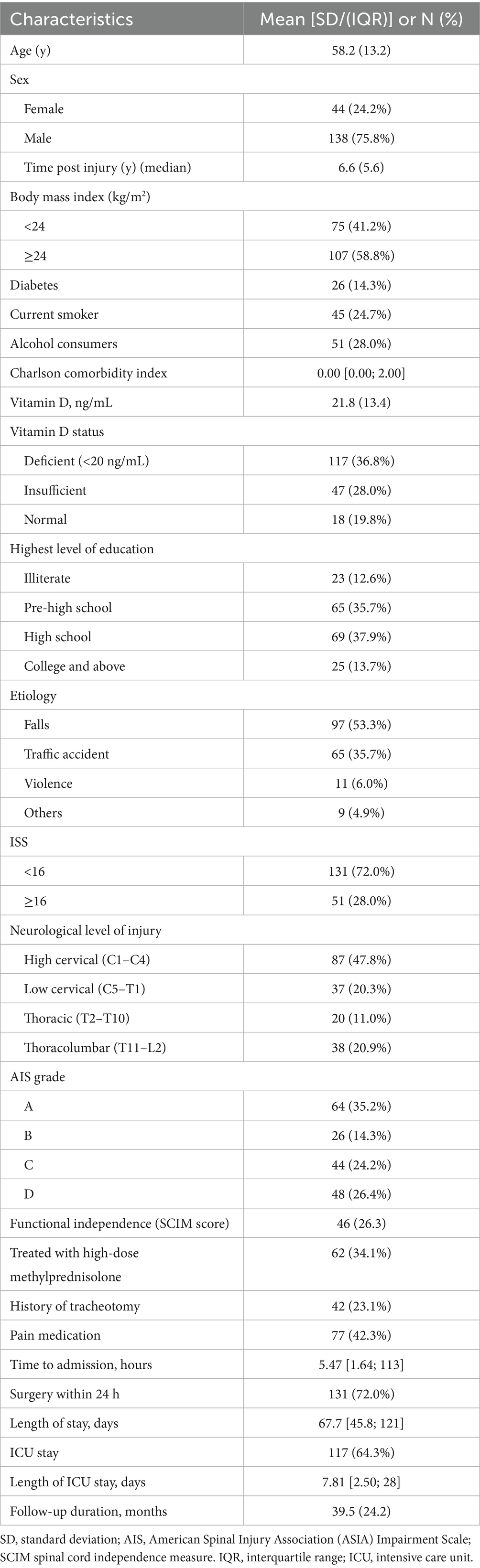 The general demographic and clinical characteristics of the participants are summarized in Table 1 (see Figure 1 for participant flow). The cohort had a mean age of 58.2 ± 13.2 years and was predominantly male (138/182, 75.8%). The primary mechanisms of injury were falls (97/182, 53.3%) and traffic accidents (65/182, 35.7%). Regarding the neurological level of injury (NLI), cervical spine injuries constituted 68.1% (124/182), with C1-4 injury levels accounting for 87 cases (47.8%) and C7-T1 injury levels accounting for 37 cases (20.3%). Thoracic level injuries (T2-T10) were present in 20 individuals (11.0%), and thoracolumbar injuries (T11-L2) in 38 individuals (20.9%). According to the AIS grade, the distribution was as follows: 64 individuals (35.2%) were grade A, 26 (14.3%) grade B, 44 (24.2%) grade C, and 48 (26.4%) grade D. Reflecting the acuity and severity of the conditions leading to their current inpatient rehabilitation admission, 42 participants (23.1%) had a history of tracheotomy, and 131 participants (72.0%) had undergone decompression and/or fixation surgery within 24 h of their initial injury. Notably, a high prevalence of suboptimal vitamin D status was observed, with 64.8% (118/182) of participants having 25(OH)D levels <30 ng/mL.