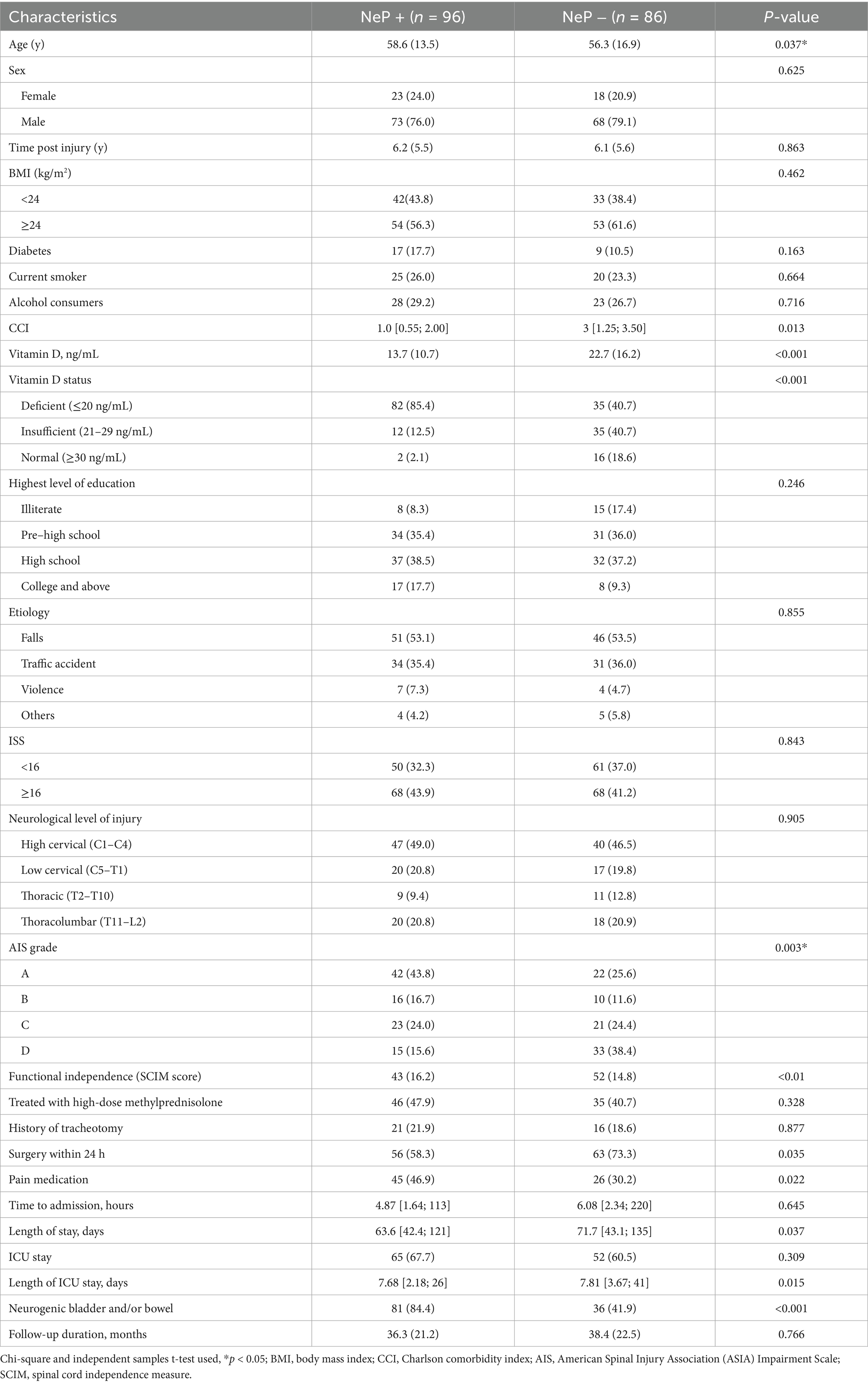 This study provides a systematic evaluation of the association between serum vitamin D levels and NeP in individuals with chronic SCI. The primary finding of this cross-sectional investigation is the high observed prevalence of NeP in this inpatient rehabilitation cohort, reaching 52.7% (96/182), which aligns with established epidemiological data (1, 5, 32). Notably, the vast majority (88.5%) of NeP cases emerged during the chronic phase (>3 months post-injury), highlighting the persistent nature of this condition and the need for sustained pain management focus long after the initial injury. In our cohort, individuals with NeP presented with greater functional impairment (lower SCIM scores) and a higher comorbidity burden (elevated CCI). Contrary to some expectations, NeP was associated with less severe neurological injuries (higher AIS grades, i.e., more motor-incomplete injuries). Furthermore, neurogenic bladder/bowel dysfunction was significantly more prevalent in those with NeP (84.4%, 81/96) compared to those without (41.9%, 36/86, p < 0.001).