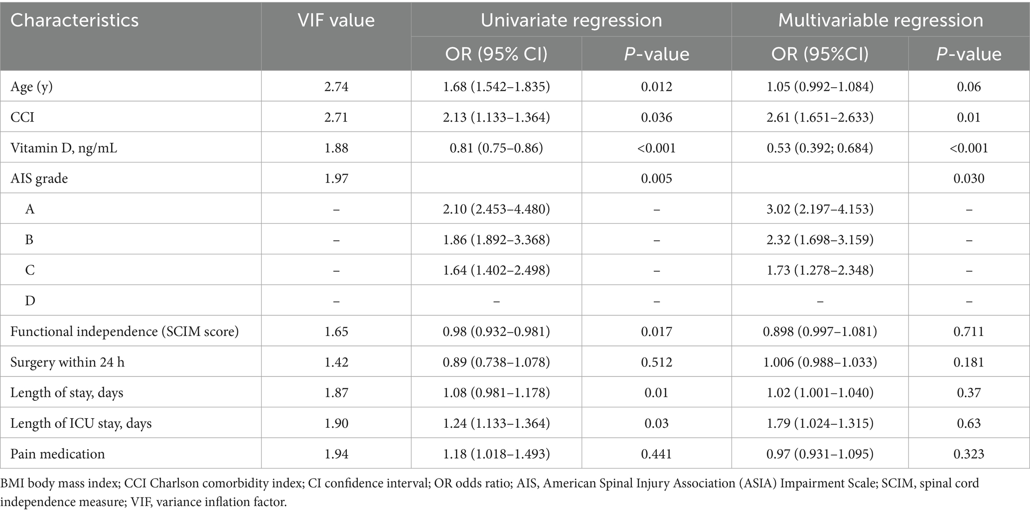As shown in Table 3, potential predictors of NeP identified in univariate regression analysis included older age, higher CCI, lower serum 25(OH)D level, higher AIS grade, longer length of stay, longer length of ICU stay, and lower SCIM score. Multicollinearity effects were ruled out as the variance inflation factor (VIF) values for all independent variables were below 3, and the average VIF value for the entire regression model was 1.68.