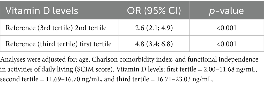 A substantial 64.8% (118/182) of patients had suboptimal vitamin D status [25(OH)D < 30 ng/mL]—a prevalence markedly higher than the 20–40% typically reported in the general population (3). This elevated rate likely reflects the cumulative effect of well-established risk factors in the SCI population, such as severely reduced mobility and sun exposure. The high prevalence of conditions requiring intensive initial care (e.g., 23.1% with a history of tracheotomy) may further limit outdoor activity early on, potentially exacerbating and prolonging deficiency.
