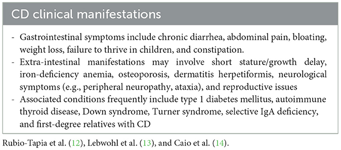 The clinical spectrum of CD is highly variable, ranging from classical gastrointestinal symptoms to extra-intestinal features and even silent or asymptomatic forms (Table 1) (12–14). Such heterogeneity frequently results in diagnostic delays, reinforcing the need to consider CD in diverse clinical scenarios (12, 15).