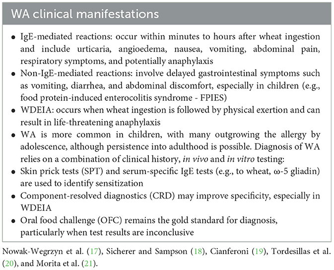 The symptoms vary depending on the underlying immune mechanism and the route of exposure (Table 2) (17–21). Accurate differentiation between WA, CD, and NCGS is essential, as their pathophysiology, clinical profile, and therapeutic approaches differ significantly (22).