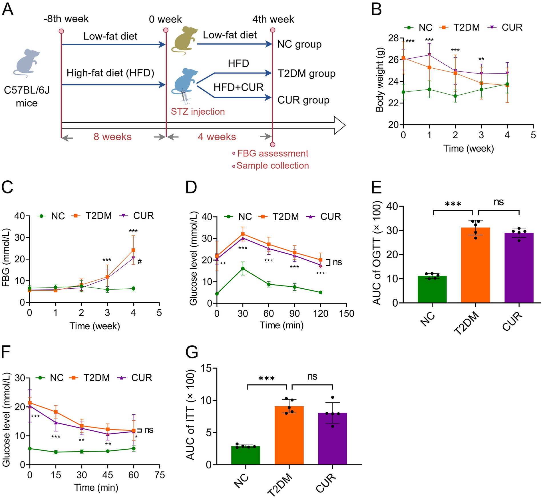 Figure 1. CUR supplementation improves FBG in T2DM mice. (A) Flowchart of the in vivo experiments was shown. (B) The body weight of mice was monitored in the NC, T2DM, and CUR groups (n = 10). (C) The weekly FBG levels were shown (n = 10). (D,E) The blood glucose levels were measured in the OGTT assays (D) and the quantitative trapezoidal AUC analysis of OGTT was presented (n = 5) (E). (F,G) The blood glucose levels were measured in the ITT assays (F) and the quantitative trapezoidal AUC analysis of ITT was presented (n = 5) (G). **p < 0.01 and ***p < 0.001: NC group vs. T2DM group; #p < 0.05: T2DM vs. CUR group; ns, not significant difference.