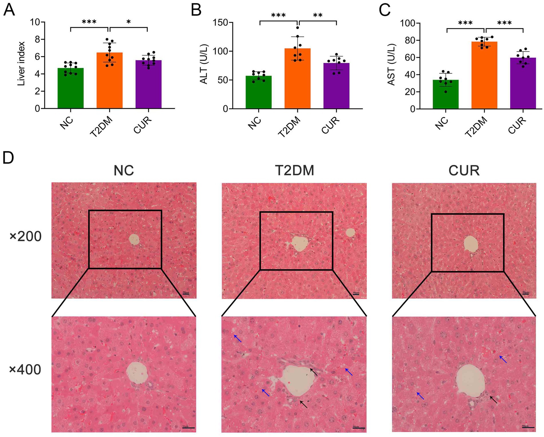 Figure 2. CUR ameliorates liver injury in T2DM mice. (A) Liver index was calculated as liver weight/body weight (n = 10). (B,C) Plasma levels of ALT (B) and AST (C) were measured (n = 8). *p < 0.05, **p < 0.01 and ***p < 0.001. (D) Representative images from HE staining of the liver were presented (n = 3). Overview (upper panel, ×200 magnification) and detailed views (lower panel, ×400 magnification) were shown. Black arrows denoted inflammatory cell infiltrates, while blue arrows indicated hepatocellular steatosis characterized by cytoplasmic microvesicular vacuolization. Scale bars: 50 μm.