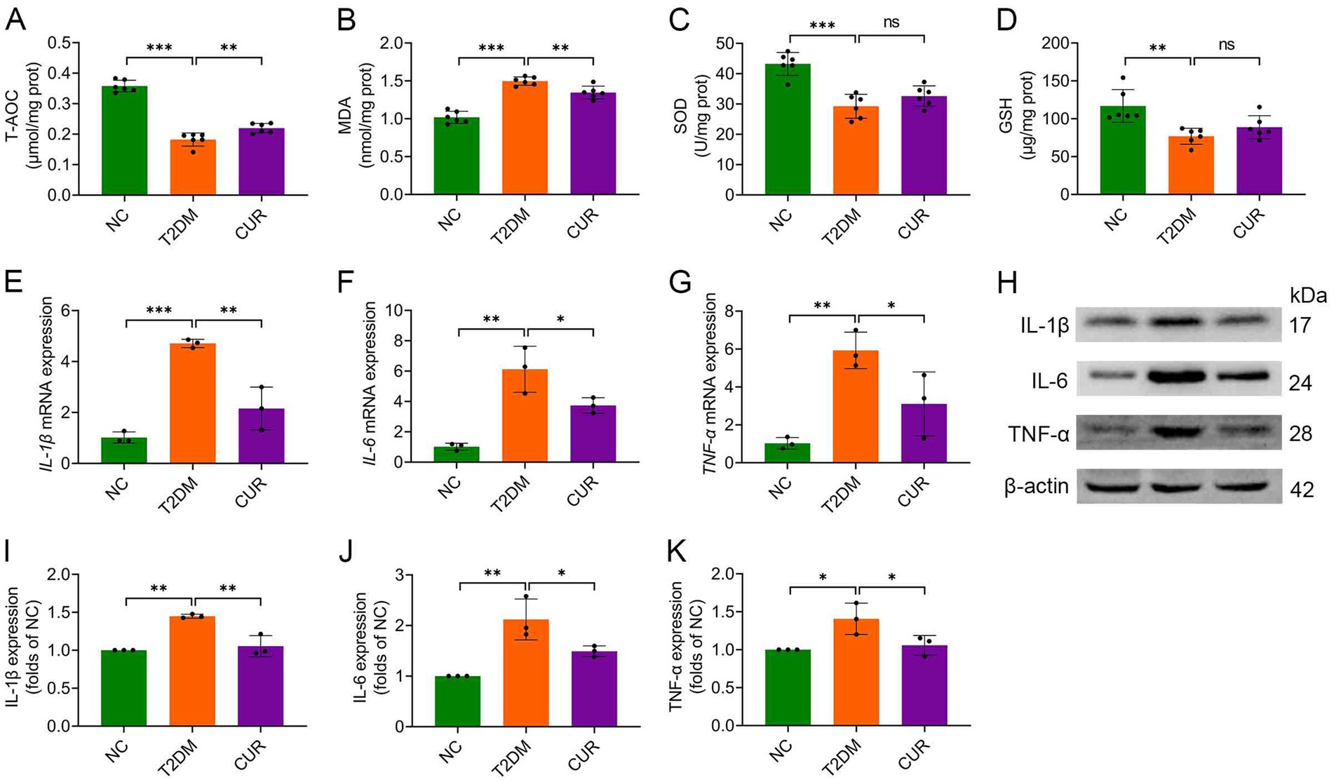 Figure 3. CUR attenuates hepatic oxidative stress and inflammation in T2DM mice. (A–D) Hepatic levels of T-AOC (A), MDA (B), SOD activity (C), and GSH (D) were determined (n = 6). (E–G) Hepatic mRNA expression levels of IL-1β (E), IL-6 (F), and TNF-α (G) were analysed (n = 3). (H) Representative Western blot bands of hepatic IL-1β, IL-6, and TNF-α proteins. β-actin served as loading control. (I–K) Quantitative hepatic protein expression levels of IL-1β (I), IL-6 (J), and TNF-α (K) were analysed (n = 3). For quantitative analysis (I–K), the band intensity of each target protein was normalized to its corresponding internal control. The normalized values were presented relative to the mean of the NC group, which was set to 1. *p < 0.05, **p < 0.01 and ***p < 0.001; ns, not significant difference.