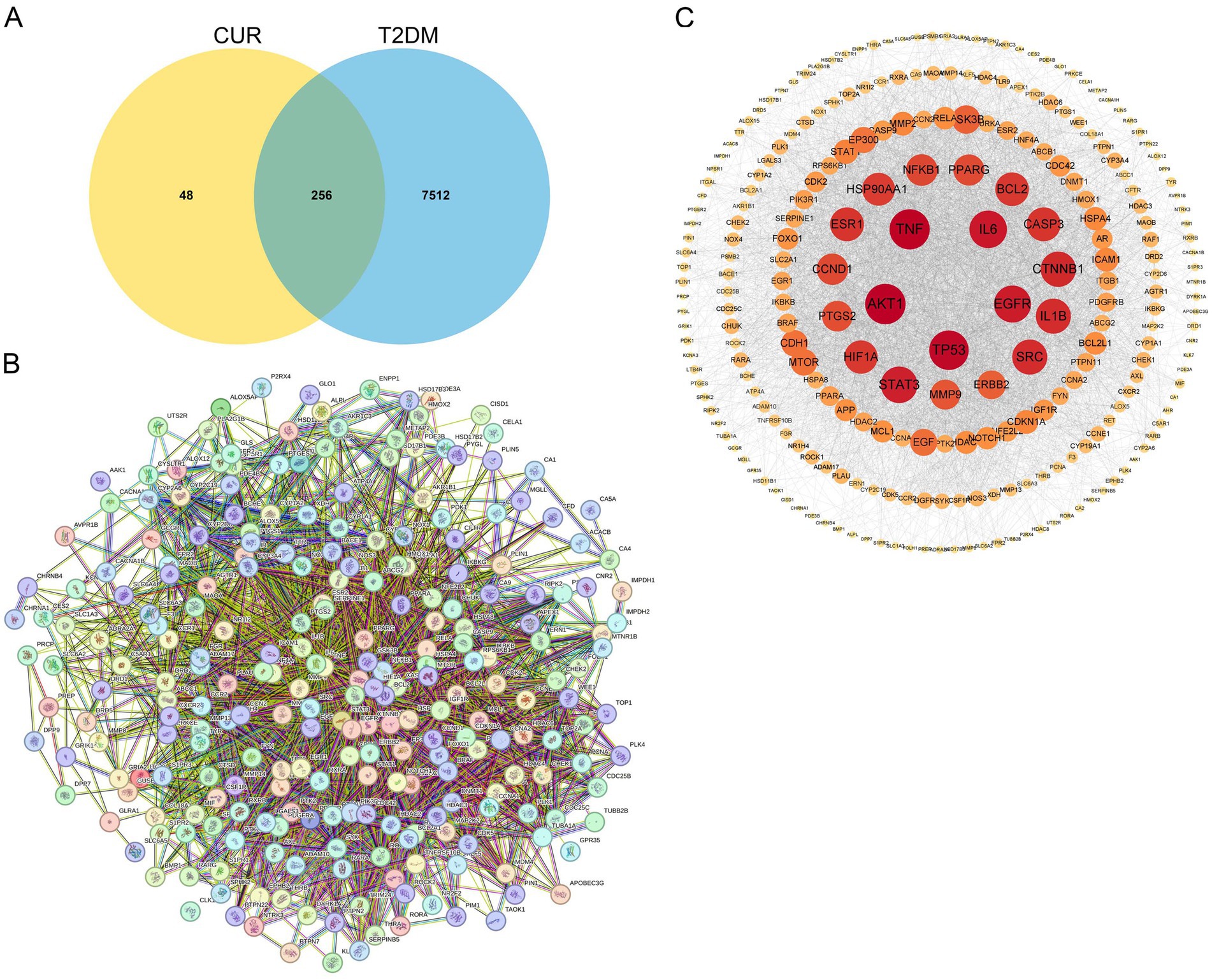 Figure 4. Identification of hub genes through PPI network analysis. (A) Venn diagram of the intersection of the CUR and T2DM target genes. (B) The PPI network of the 256 common targets was constructed using the STRING database. Each node represents a relevant gene, and the edge thickness indicates the strength of the data support. (C) Proteins within the PPI network were ranked by their degree centrality.