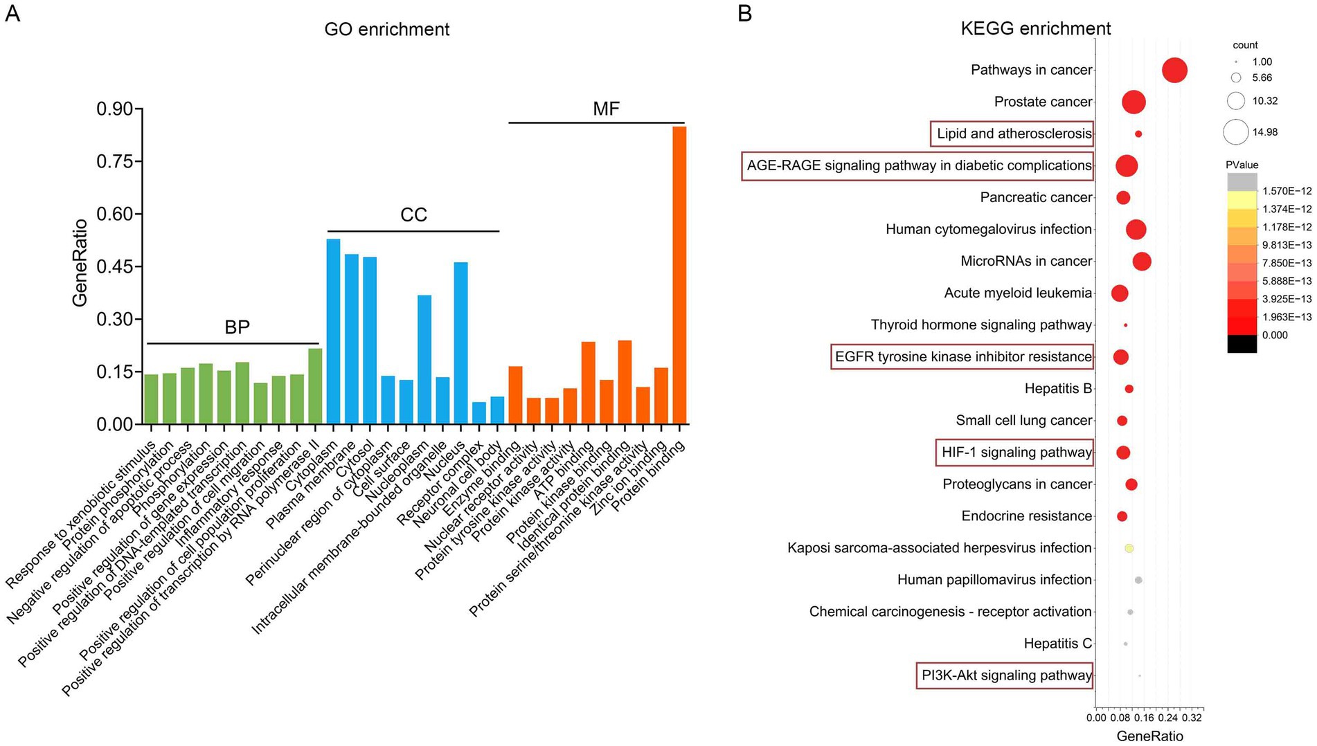 Figure 5. Functional enrichment analysis implicates the AGE–RAGE pathway. (A) The top 10 BP, MF and CC in GO enrichment analysis were shown. (B) Bubble chart of the top 20 KEGG pathways.