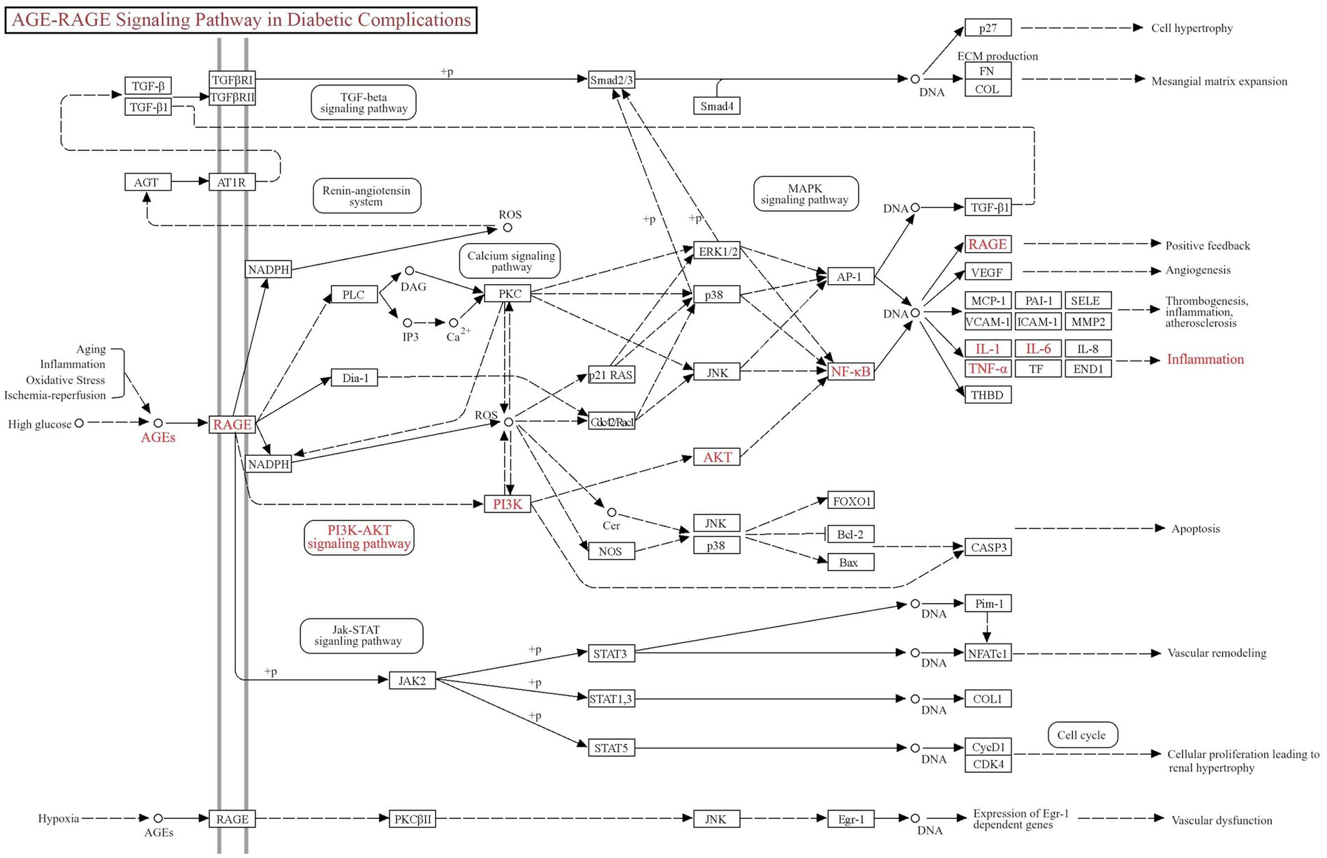 GO and KEGG pathway enrichment analyses were performed with a false discovery rate (FDR) threshold of <0.01 for statistical significance. We identified 615 significantly enriched GO terms, comprising 430 BP, 70 CC, and 115 MF. KEGG pathway analysis revealed 168 significantly enriched pathways. The most prominently enriched pathways involved in metabolic disorders, inflammatory damage related functions included AGE–RAGE signaling pathway in diabetic complications, EGFR tyrosine kinase inhibitor resistance, HIF-1 signaling pathway, lipid and atherosclerosis, and PI3K-Akt signaling pathway. Based on FDR and GeneRatio, the top 10 GO entries and top 20 KEGG pathways were shown in Figures 5A,B, respectively. A tripartite network integrating CUR, predicted targets, and enriched pathways was constructed in Cytoscape, as shown in Supplementary Figure S1. KEGG enrichment analysis from our network pharmacology highlighted the AGE–RAGE signaling pathway in diabetic complications as the most relevant. This pathway orchestrates sustained oxidative stress and inflammatory responses through RAGE-mediated PI3K/Akt signaling and NFκB nuclear translocation (Figure 6).