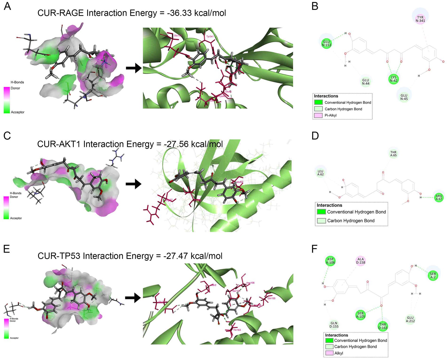 Figure 7. Molecular docking analysis of CUR binding to RAGE, AKT1, and TP53. (A,C,E) Left panels: Receptor surface diagrams showing hydrogen bond interactions. Right panels: 3D binding poses of CUR with target proteins. (B,D,F) Corresponding 2D ligand interaction diagrams. (A,B) CUR-RAGE complex (Binding energy: −36.33 kcal/mol). (C,D) CUR-AKT1 complex (Binding energy: −27.56 kcal/mol). (E,F) CUR-TP53 complex (Binding energy: −27.47 kcal/mol).