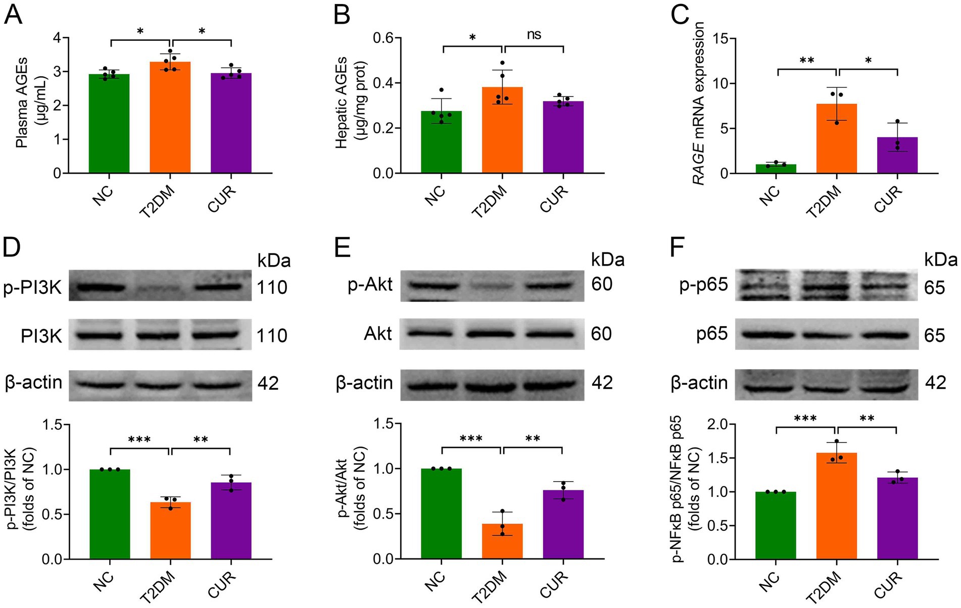 Figure 8. CUR modulates AGE/RAGE signaling and its downstream targets PI3K/Akt and NFκB pathways. (A,B) The levels of plasma (A) and hepatic AGEs (B) were measured by ELISA (n = 5). (C) The mRNA expression levels of RAGE in the liver were analysed (n = 3). (D–F) Representative bands and quantitative expression levels of p-PI3K, PI3K, p-Akt, Akt, p-NFκB p65, and NFκB p65 proteins in the liver from Western blot were presented. β-actin was served as an internal reference (n = 3). For quantitative analysis (D–F), the band intensity of each target protein was normalized to its corresponding internal control. The normalized values were presented relative to the mean of the NC group, which was set to 1. *p < 0.05, **p < 0.01 and ***p < 0.001; ns, not significant difference.