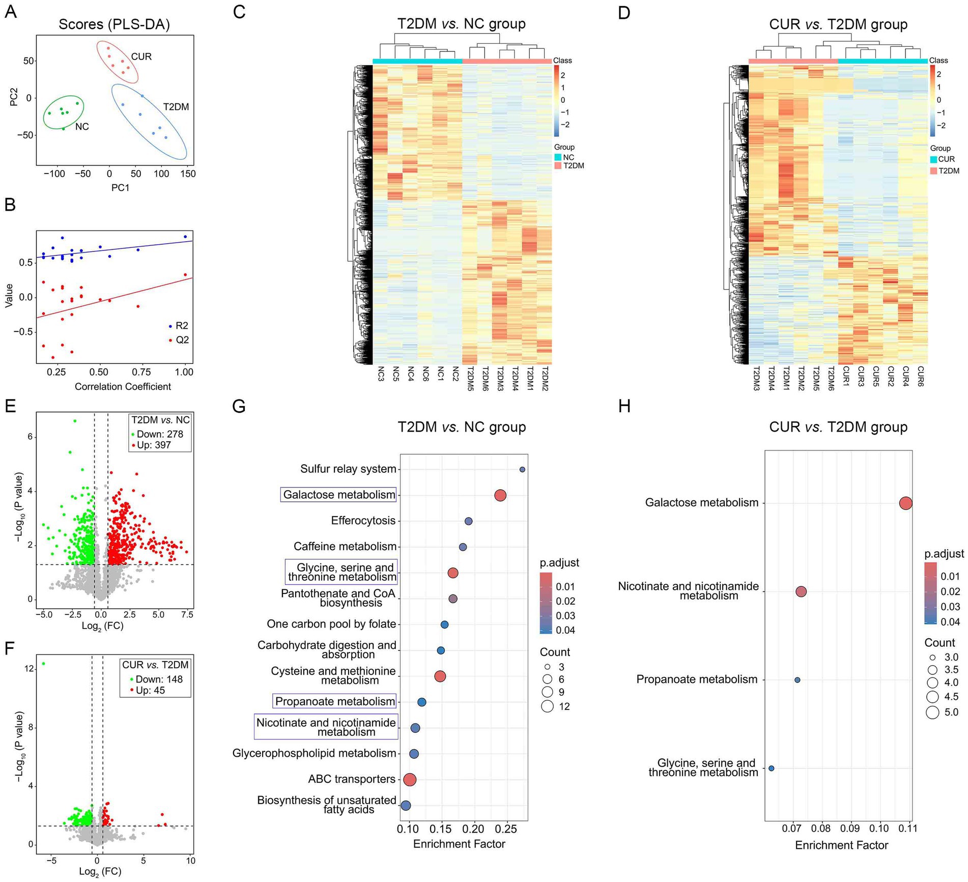 Figure 9. Untargeted metabolomic profiling of liver tissues using UPLC–MS/MS. (A) PLS-DA score plot visualizing metabolic distinctions among the three groups. (B) R2Y and Q2Y values of the PLS-DA model. (C,D) Hierarchical clustering heatmaps of significantly altered metabolites indicating distinct metabolic profiles between comparative groups. (E,F) Volcano plots for NC vs. T2DM group (E), and T2DM vs. CUR group (F). (G,H) KEGG enrichment analysis based on differential metabolites for T2DM vs. NC group (G), and CUR vs. T2DM group (H). Significantly enriched pathways identified via p-values and Rich Factor analysis.