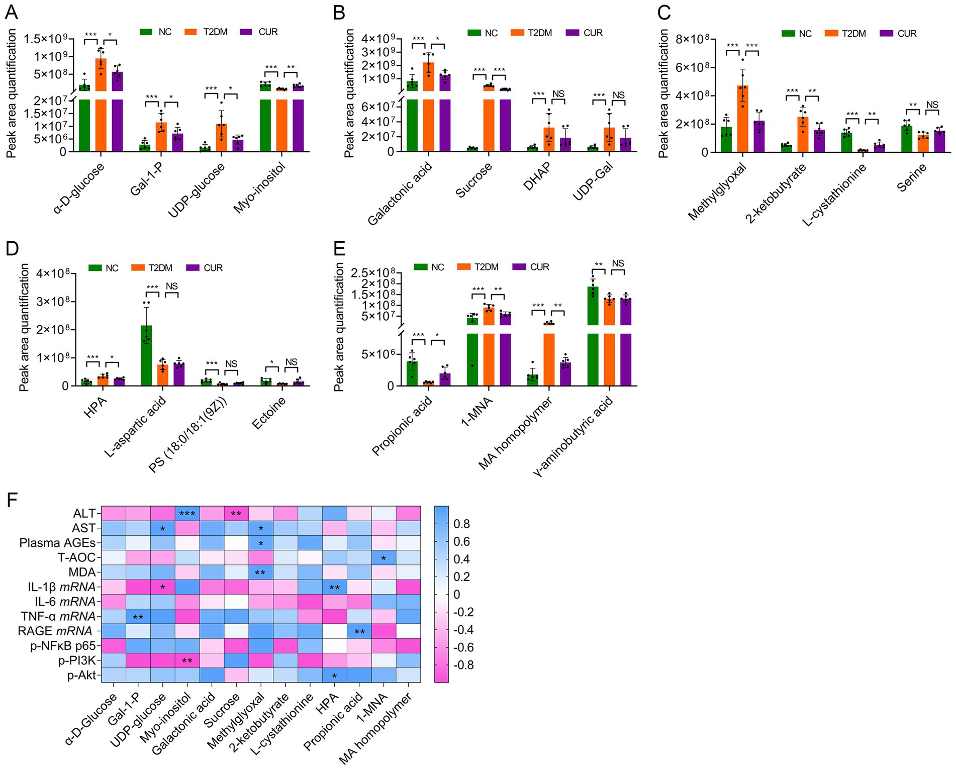 Figure 10. Differential metabolites among the NC, T2DM and CUR groups according to UPLC–MS/MS analysis. (A–E) Comparations of hepatic metabolite contents according to their peak area quantification were shown. *p < 0.05, **p < 0.01 and ***p < 0.001; ns, not significant difference (n = 6). (F) Association between differential metabolites and biological parameters was performed using Pearson’s correlation analysis. *p < 0.05 and **p < 0.01.