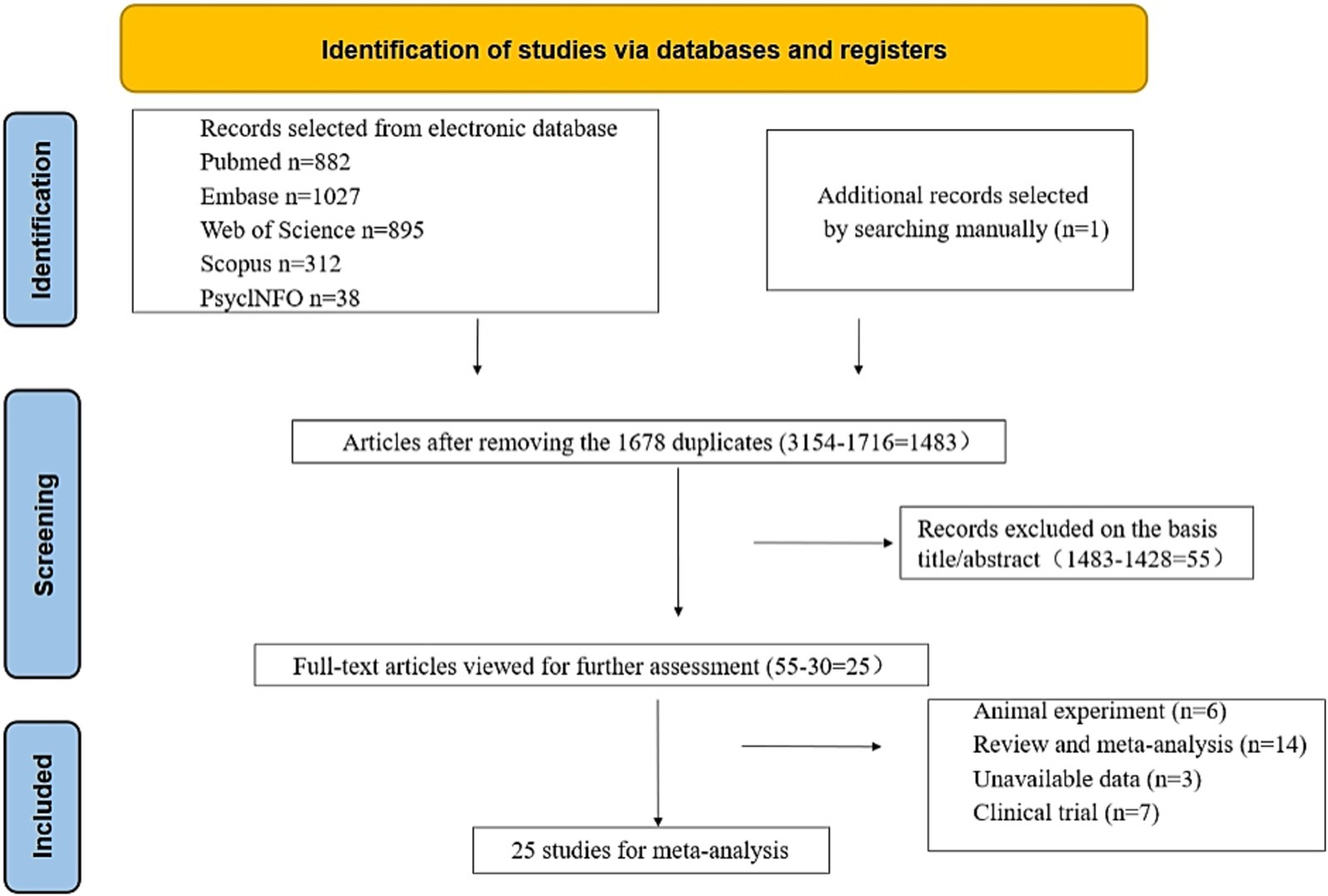 Flowchart illustrating the identification and screening process for studies via databases and registers. Records selected from various databases: Pubmed (882), Embase (1027), Web of Science (895), Scopus (312), and PsycINFO (38), totaling 3154. One additional record was identified manually. After removing 1678 duplicates, 1483 articles remained. Following title or abstract screening, 55 records were excluded, leaving 55 articles for full-text assessment. Thirty were excluded due to animal experiments (6), reviews and meta-analyses (14), unavailable data (3), and clinical trials (7). Twenty-five studies were included in the meta-analysis.