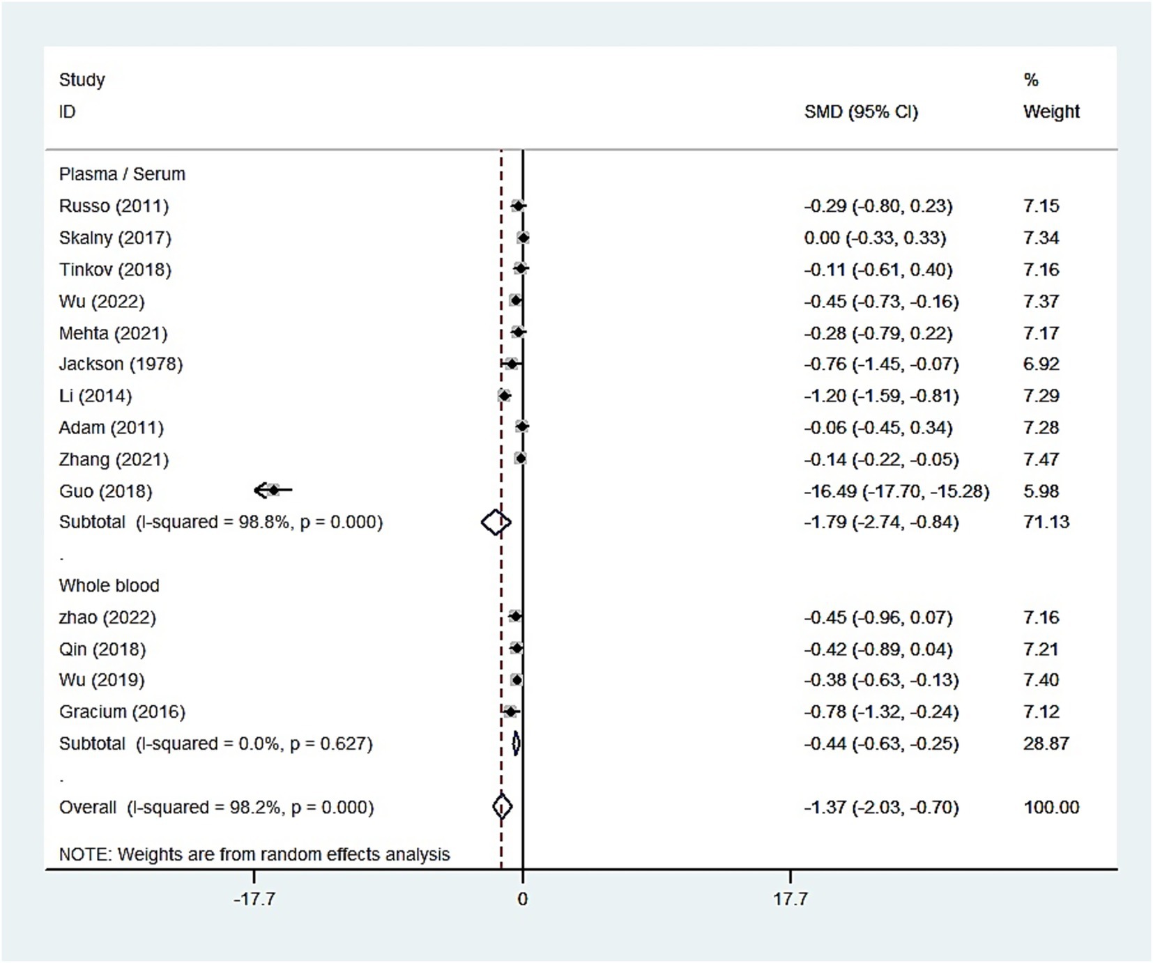 Forest plot showing standardized mean differences (SMD) and 95% confidence intervals for various studies on plasma/serum and whole blood. Each study is represented by a point estimate and a horizontal line indicating the confidence interval. The subtotal for plasma/serum shows a high I-squared value of 98.8% with a significant p-value of 0.000. The overall effect size is indicated with an SMD of -1.37, with a significant p-value, and an I-squared of 98.2%. Weights for each study are based on random effects analysis.