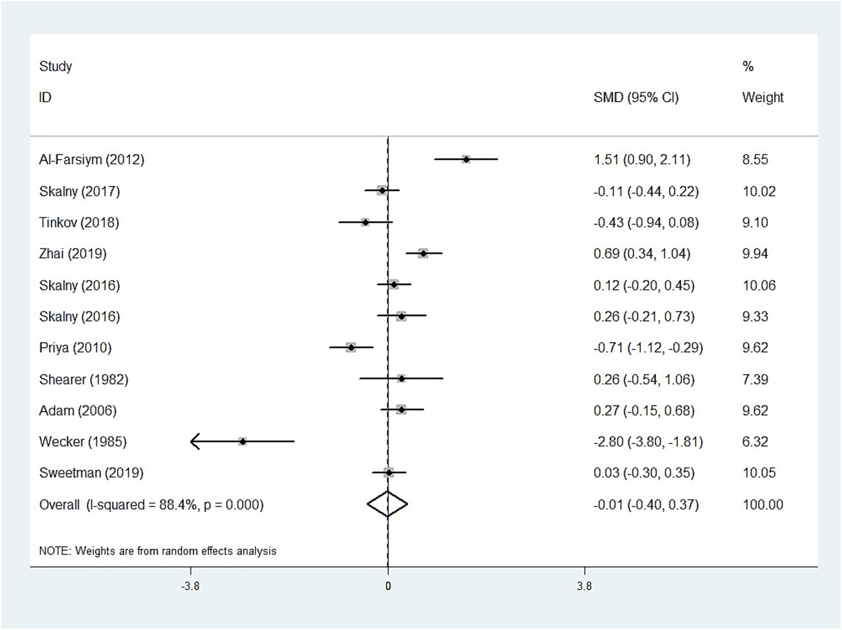 Forest plot displaying studies on a horizontal axis from negative 3.8 to 3.8. Each study is represented by a line and square, with diamond for overall result. The center vertical line marks zero. Results show a range of standard mean differences with confidence intervals and weights noted on the right. Overall effect is close to zero.