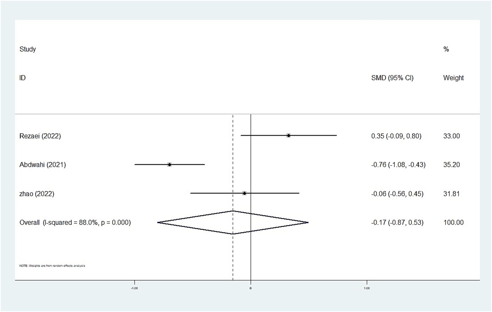 Forest plot showing results of three studies: Rezaei (2022) with SMD 0.35, CI (-0.09, 0.80), weight 33%; Abdwahi (2021) with SMD -0.76, CI (-1.08, -0.43), weight 35.2%; Zhao (2022) with SMD -0.06, CI (-0.56, 0.45), weight 31.81%. Overall SMD is -0.17. Heterogeneity I-squared is 88%, p = 0.000.