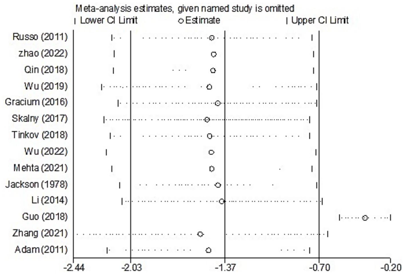 Forest plot showing meta-analysis estimates for various studies with suppression of one study at a time, affecting confidence intervals. The x-axis shows confidence interval limits from negative 2.44 to negative 0.20. Each study is represented with its lower limit, estimate, and upper limit.
