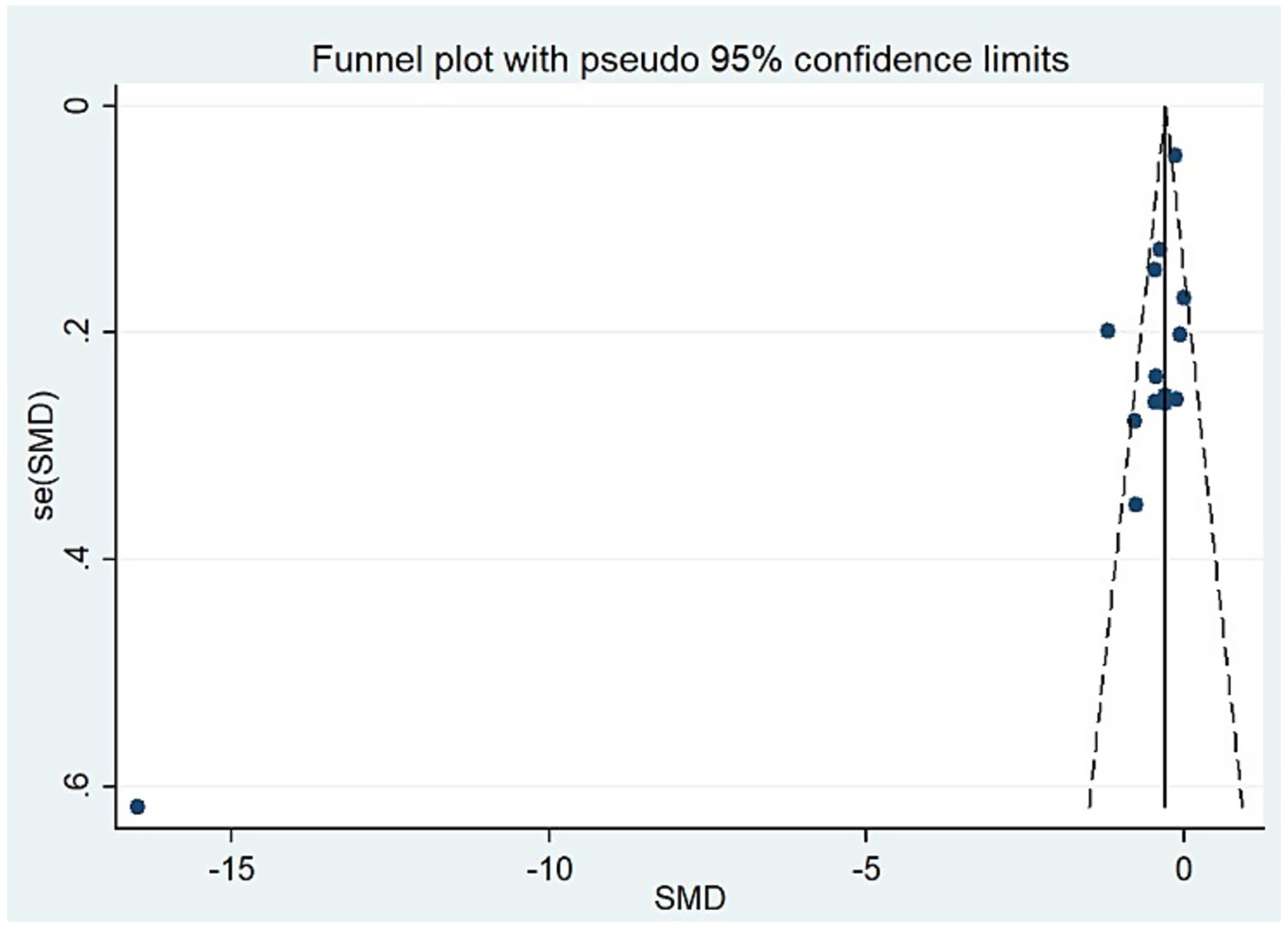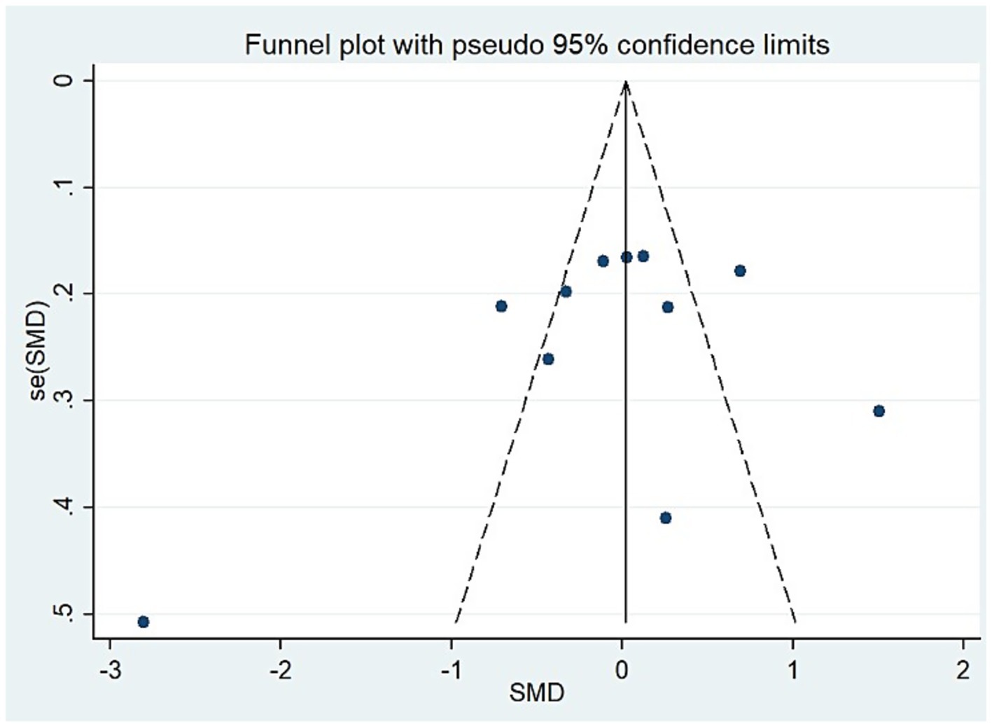 Funnel plot displaying the standard error of the standardized mean difference (SMD) against SMD values. Data points are mostly clustered within pseudo 95% confidence limits, forming an inverted funnel shape.