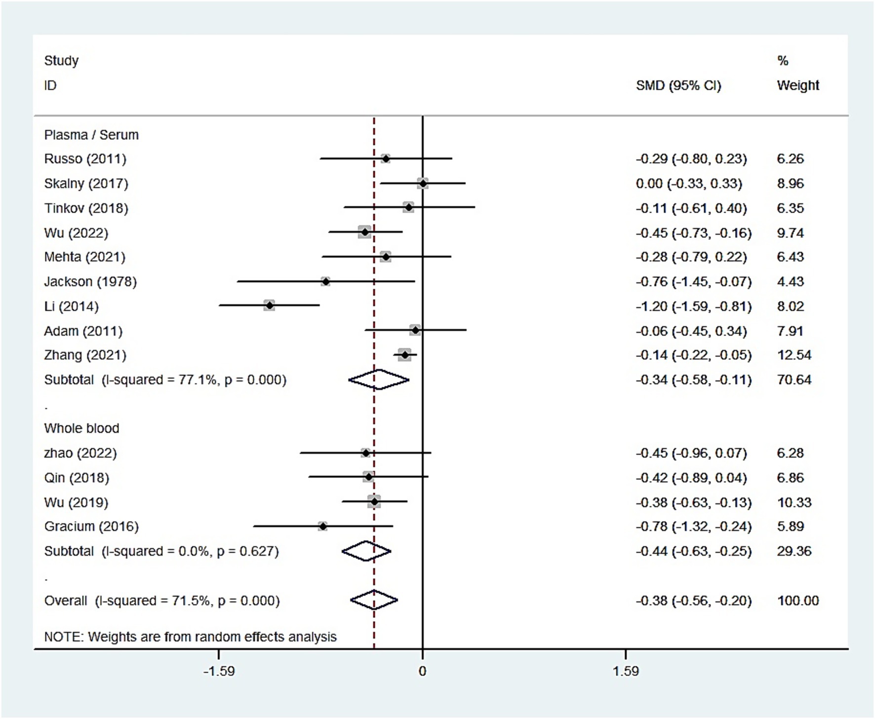 Figure 7. Forest plot of the blood zinc levels in children with autism spectrum disorder and controls [excluding Guo et al. (41)].