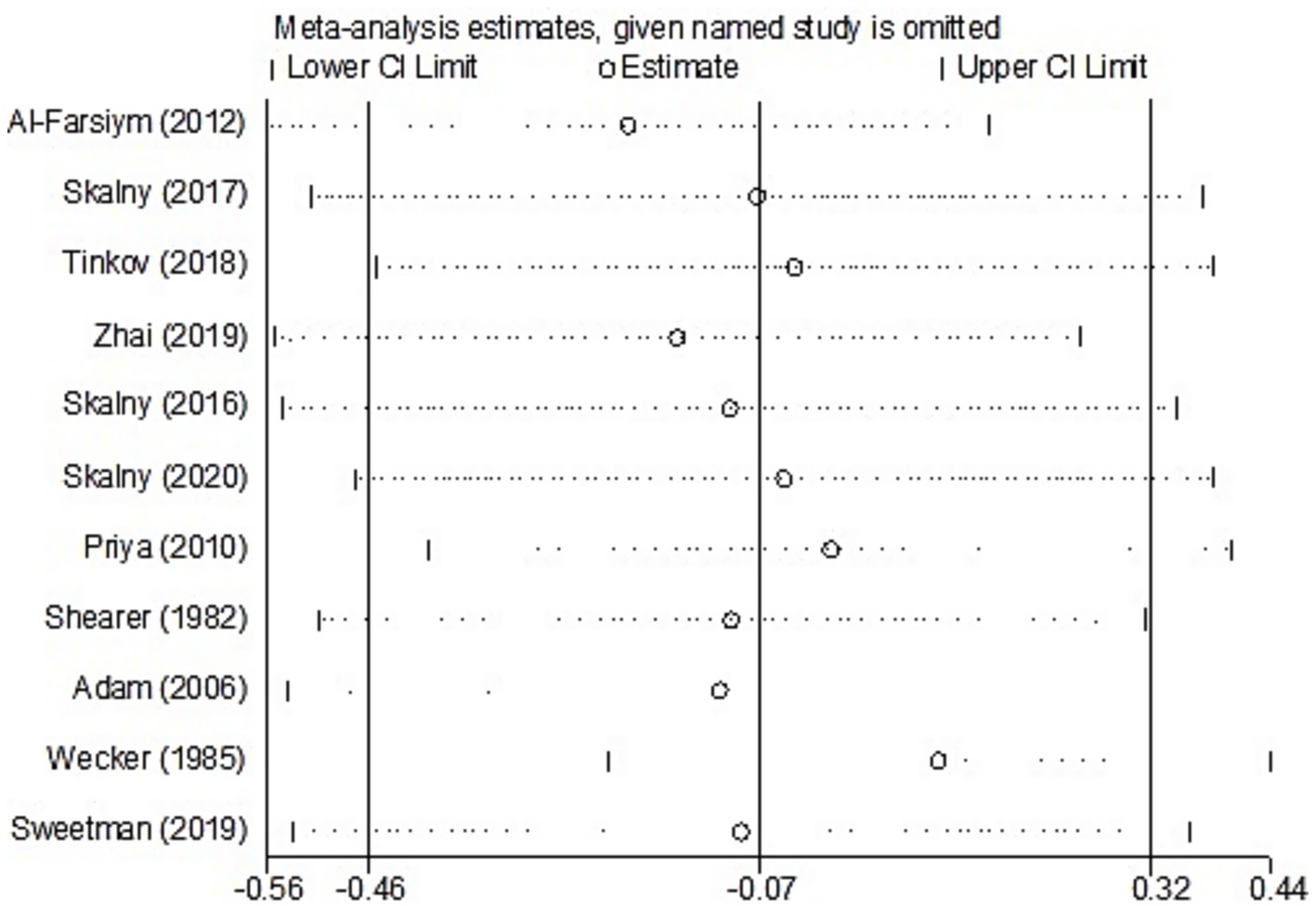 Forest plot showing meta-analysis estimates with individual studies omitted. The horizontal lines represent the confidence intervals for each study, while circles indicate point estimates. Studies listed on the left include Al-Farsiym (2012), Skalny (2017, 2016, 2020), Tinkov (2018), Zhai (2019), Priya (2010), Shearer (1982), Adam (2006), Wecker (1985), and Sweetman (2019). The x-axis ranges from negative zero point five six to zero point four four.