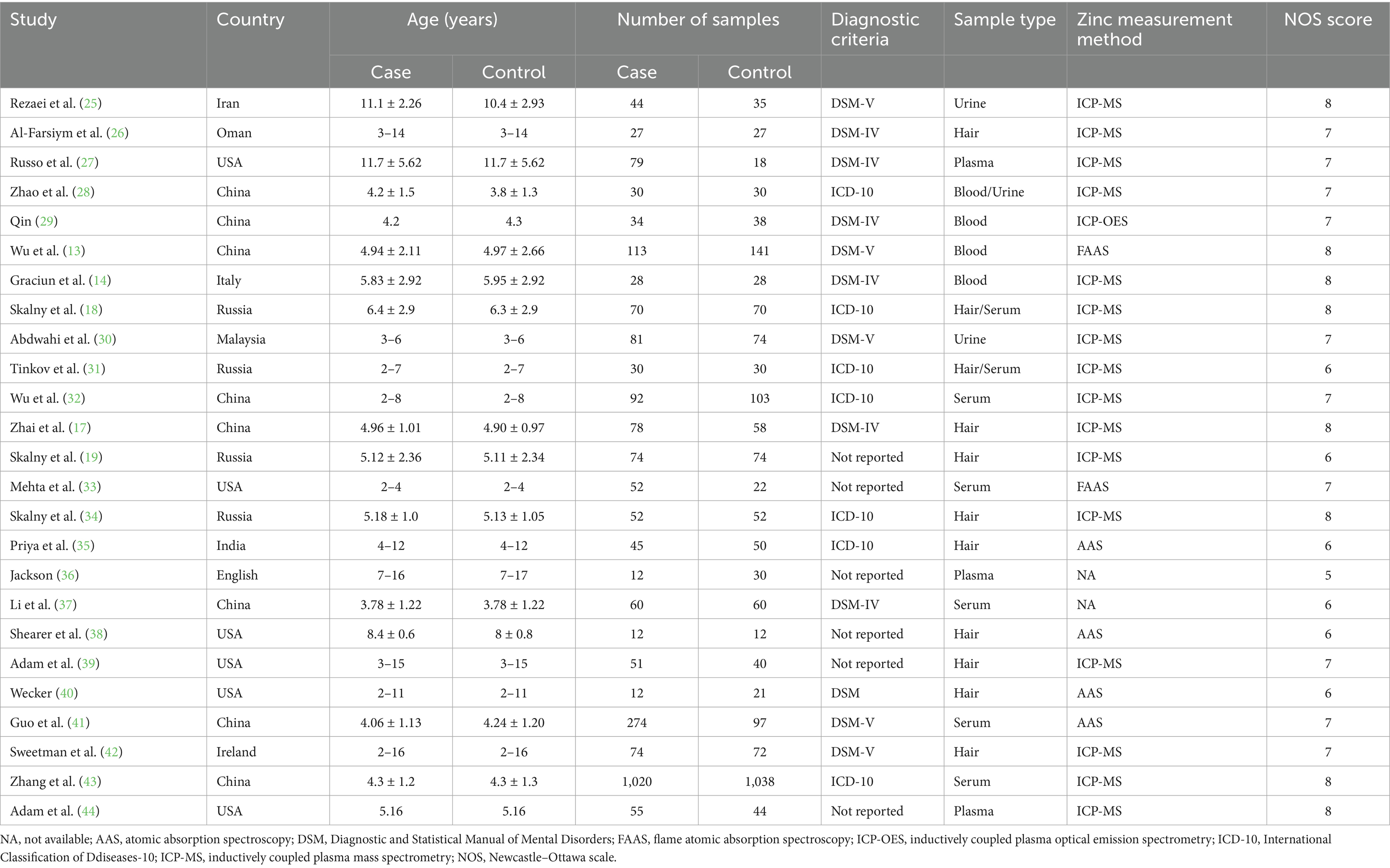 Table 1 presents the primary features of the 25 case–control studies included in this meta-analysis, which were published between 1978 and 2023. Among the 14 studies (case: 1,949 and control: 1,749) examining the correlation between blood zinc and ASD, 7 focused on serum zinc (case: 1,598 and control: 1,420), 3 focused on plasma zinc (case: 146 and control: 92), and 4 focused on the zinc concentration in whole blood (case: 205 and control: 237). Furthermore, Table 2 provides the quality assessments of the included studies.