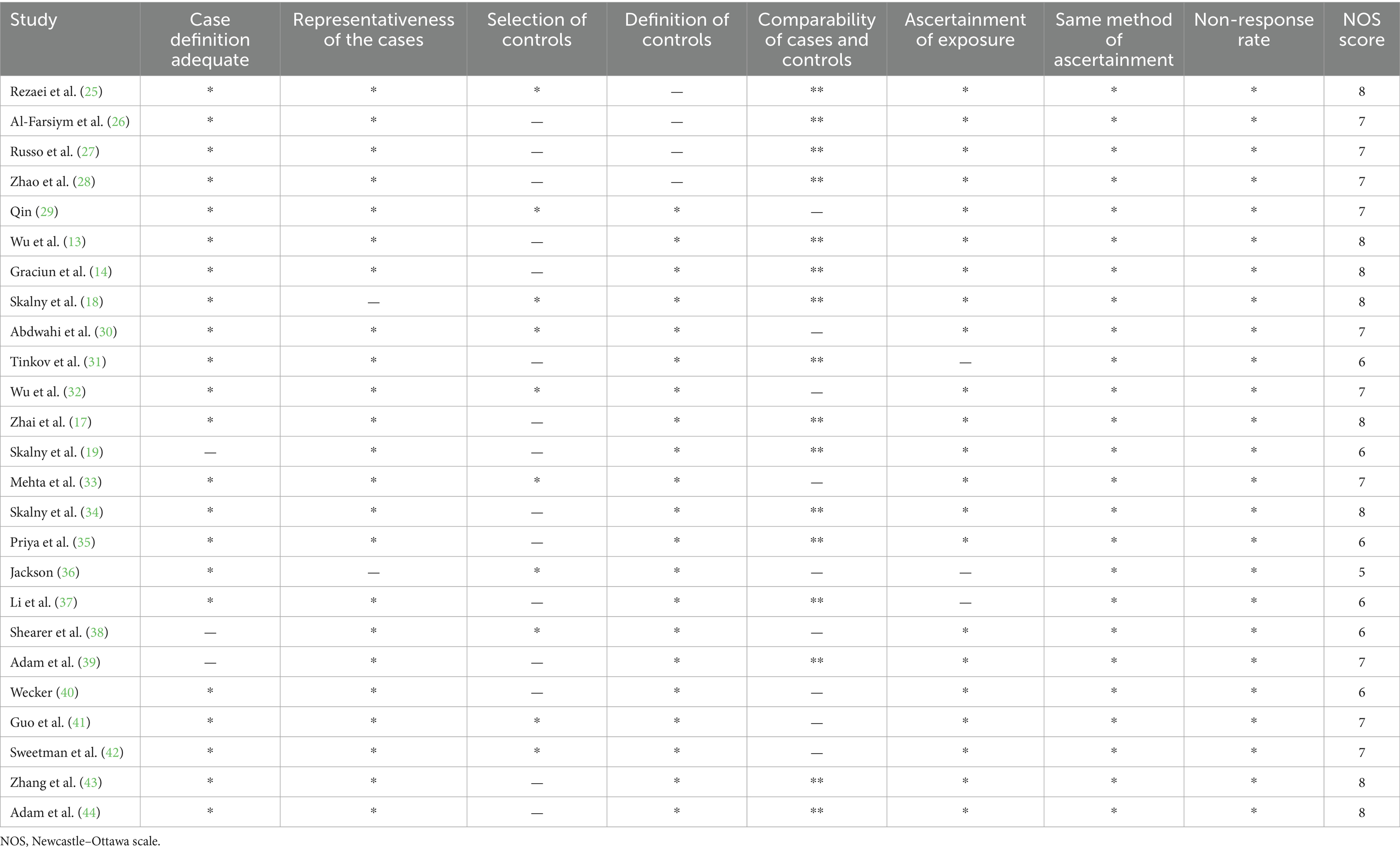 The Newcastle–Ottawa scale (NOS) was used to evaluate each study using six items in three groups, including selection, exposure, and comparability. In addition to the Comparability item, each item could receive 1 point (1 star), with the total range being 0 to 2 stars (22). The final scores for the classification of the risk of bias were as follows: ≥7 stars, high quality; ≥4 and ≤6 stars, moderate quality; and <4 stars, low quality.