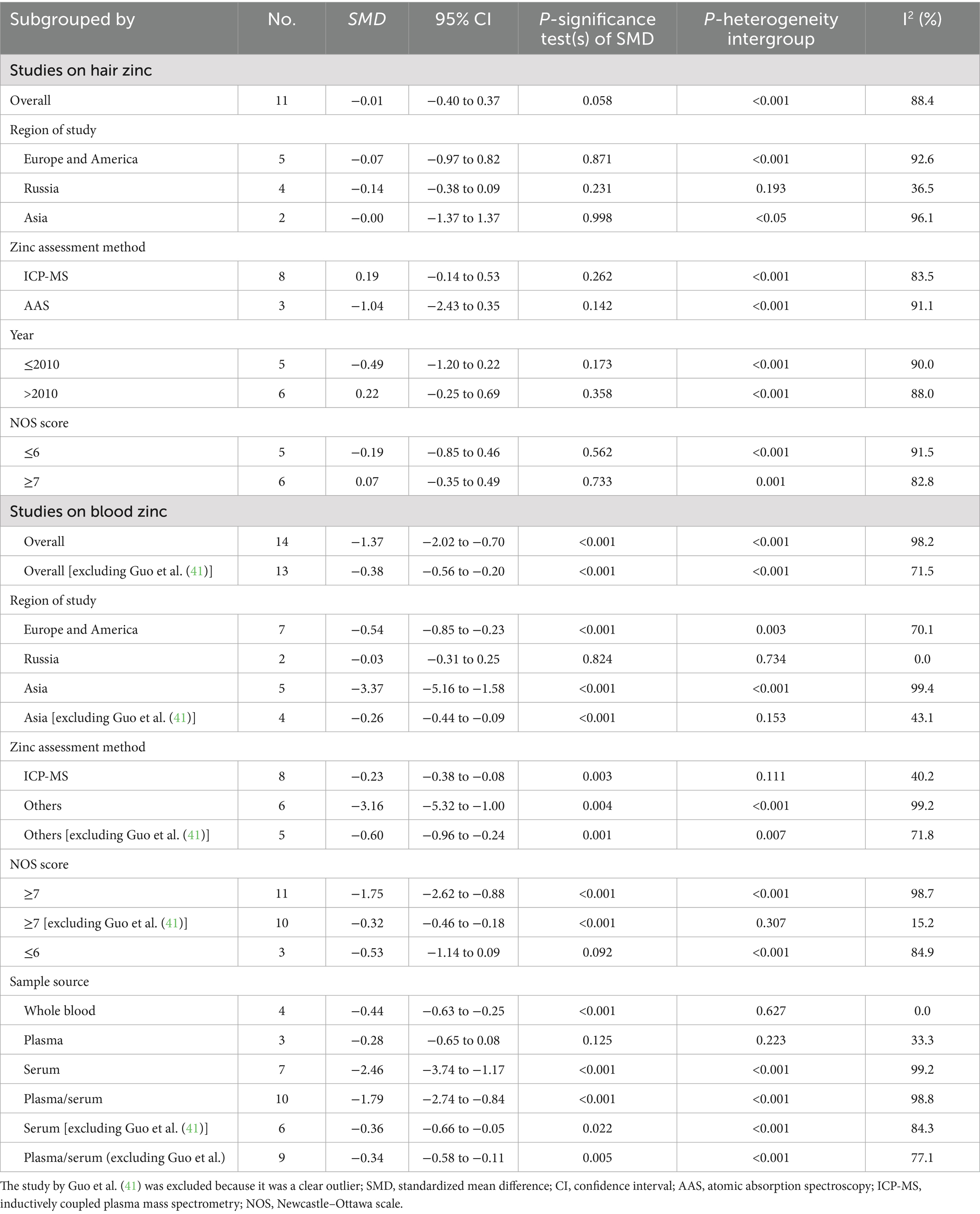 There was substantial heterogeneity among the included studies. The high heterogeneity observed in this meta-analysis may be attributed to various variables, such as demographics, sample source, assessment method, and adjusted statistical parameters. Therefore, the random-effects model was used to pool the data, and subgroup and sensitivity analyses were performed to investigate the sources of heterogeneity (24). The heterogeneity was reduced for the sample source and the zinc assessment method when exploring the sources of heterogeneity in studies on blood zinc. In our analysis, blood zinc levels included whole blood, serum, and plasma, which also accounted for the high heterogeneity observed. Previous studies have suggested that zinc concentrations in platelets, polymorphonuclear cells, mononuclear cells, and erythrocytes are not effective biomarkers of zinc status (9). Furthermore, serum and plasma zinc concentrations do not differ significantly in their relation to zinc nutritional status and are therefore used interchangeably in systematic reviews. Therefore, in addition to conducting a separate analysis of whole blood, we also pooled data from plasma and serum studies. The results from these analyses similarly indicated an association between zinc and ASD. In addition, previous research has compared serum and plasma zinc measurements using the atomic absorption spectrometer (AAS), inductively coupled plasma optical emission spectrometer (ICP-OES), and ICP-MS. Despite yielding similar zinc concentrations, accuracy, and precision when standardized materials and methods are applied, serum and plasma zinc measurements consistently show the highest coefficients of variation—regardless of the analytical platform used (AAS, ICP-OES, or ICP-MS) (46). Therefore, future studies should focus on methodological improvements, particularly for ICP-MS, to improve measurement precision. We found that, in the majority of studies, in addition to measuring blood zinc levels, hair zinc measurements are also commonly used in research involving individuals with ASD due to their advantages as a relevant, non-invasive, and easily collectible method (6). However, hair metal measurements can be affected by external contamination that is not easily removed through simple washing; therefore, hair zinc level testing is generally not recommended. In addition, sensitivity analyses identified the study by Guo et al. (41) as a clear outlier. After removing this study, the combined outcome was slightly altered, and heterogeneity was reduced; however, no substantial changes were observed, and the conclusion that blood zinc levels are negatively associated with ASD remained unchanged.