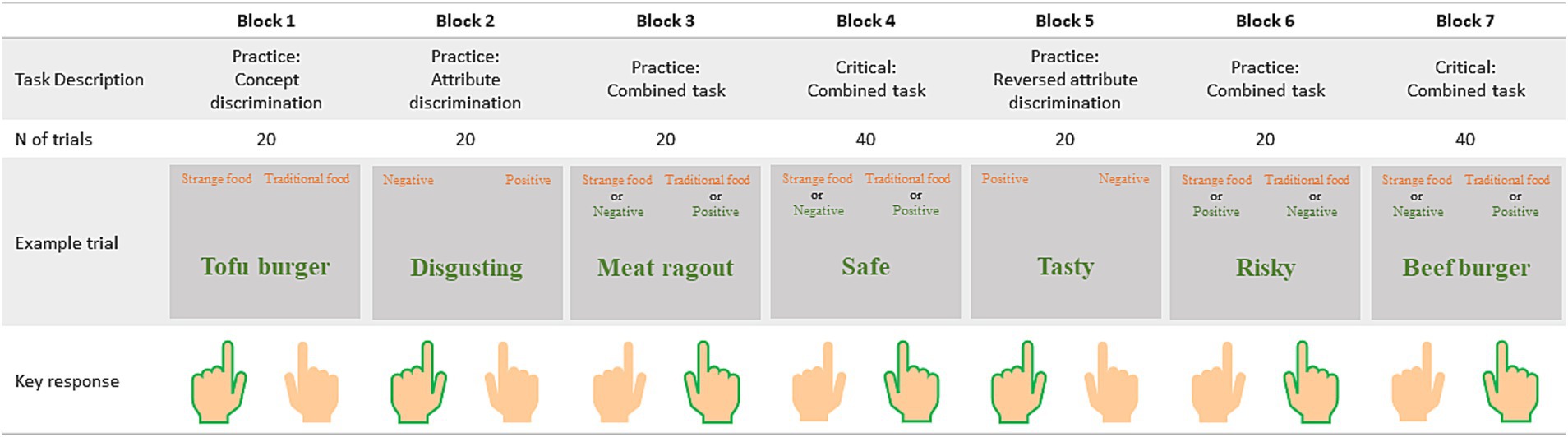 Figure 1. Example of the IAT structure. The protocol includes four counterbalanced conditions to mitigate potential order effects related to category labels. In summary, if a participant follows the pattern outlined in the table, subsequent participants will respond to the concept “plant-based food” or the negative attributes by pressing the right-key button.