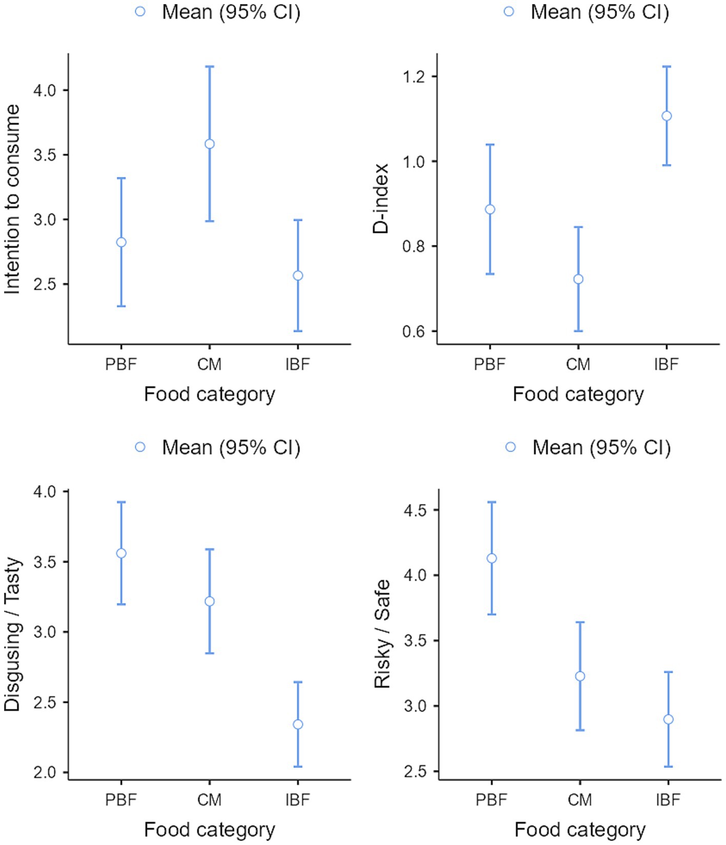 Figure 2. Results of the ANOVAs. The graph in the top left indicates that the intention to consume CM was significantly higher than the intention to consume IBF, while the intention to consume PBF fell in between the two. The graph in the top right shows that the automatic attitudes were more favorable toward CM and PBF than IBF. The bottom left graph reveals that IBF was rated significantly more disgusting than CM and PBF. Finally, the graph in the bottom right illustrates that IBF and CM were rated significantly less safe than PBF.