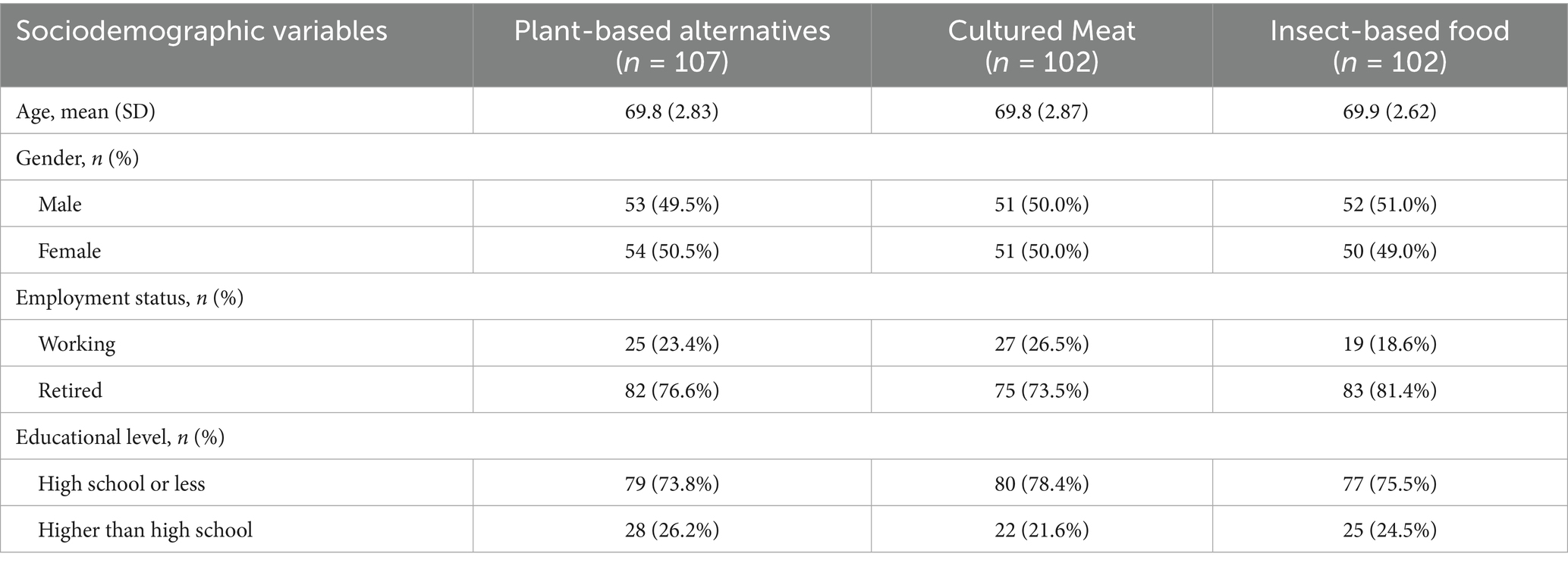 The study addresses important gaps in the literature on alternative protein sources (APS) by focusing specifically on the aging population. This group is often underrepresented in this field, despite being particularly vulnerable to protein-energy malnutrition. Previous research has predominantly introduced this group as part of mixed-age samples, often constituting only a minor segment (56). Instead, younger adults have been more frequently targeted as future consumers and recipients of communication interventions (57). However, the older adults could also benefit from appropriate tools and tailored information to introduce safe foods into their diets that are beneficial for metabolism and maintaining muscle mass.