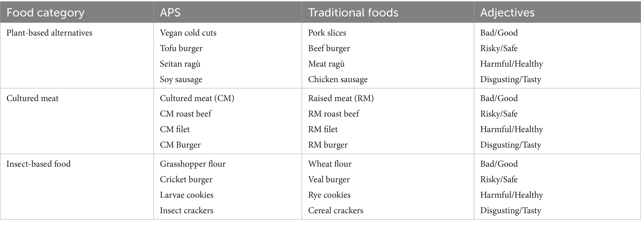Explicit attitudes toward each product were measured by asking participants to think about it and evaluate it on a 7-point Likert scale using two pairs of adjectives within a semantic differential scale adapted from Maggino and Mola (73). The adjectives used were: “Risky” vs. “Safe” and “Disgusting” vs. “Tasty.” An example item was “What adjectives do you think are most suitable to describe -product-?” A higher score indicated a more positive attitude toward the food category. A mean score was calculated for each couple of adjectives. All scores showed good internal consistency (Cronbach’s alpha ranged from 0.88 to 0.95). In the case of CM, only one item was used to represent the general category.