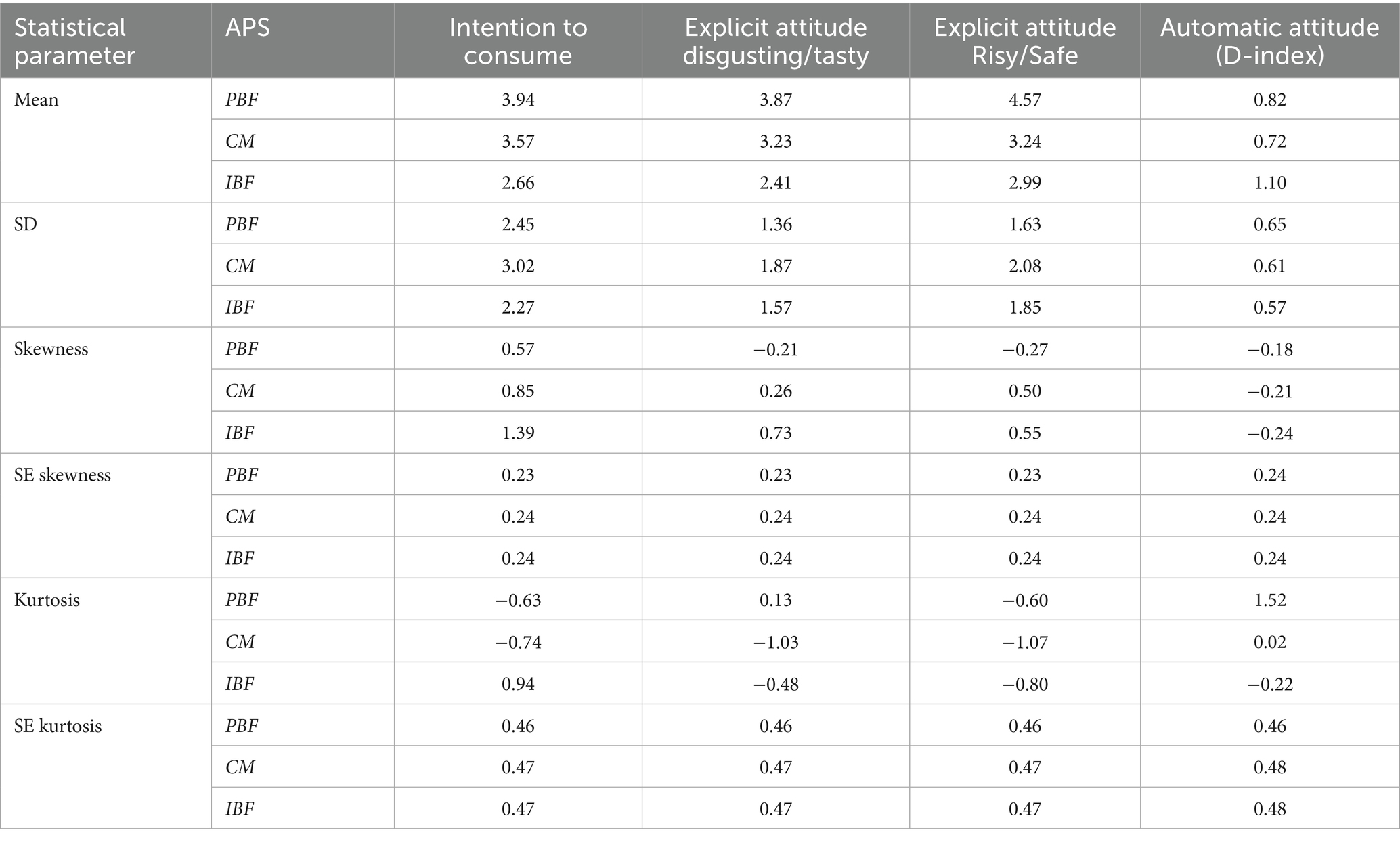 The present study is situated within this theoretical framework, aiming to investigate from a psychological perspective the factors most closely associated with openness toward APS, with a particular interest in the intention to consume (ITC). We focused on the role of attitudes, given their well-established connection with behavioral intentions (52, 53). According to the Theory of Planned Behavior (52), among other factors, favorable attitudes substantially increase the likelihood of forming a corresponding intention, which in turn predicts the actual enactment of the behavior. In the context of food consumption, positive attitudes toward specific products have consistently been shown to enhance consumers’ willingness and intention to incorporate them into their diets, including APS (30, 54, 55).