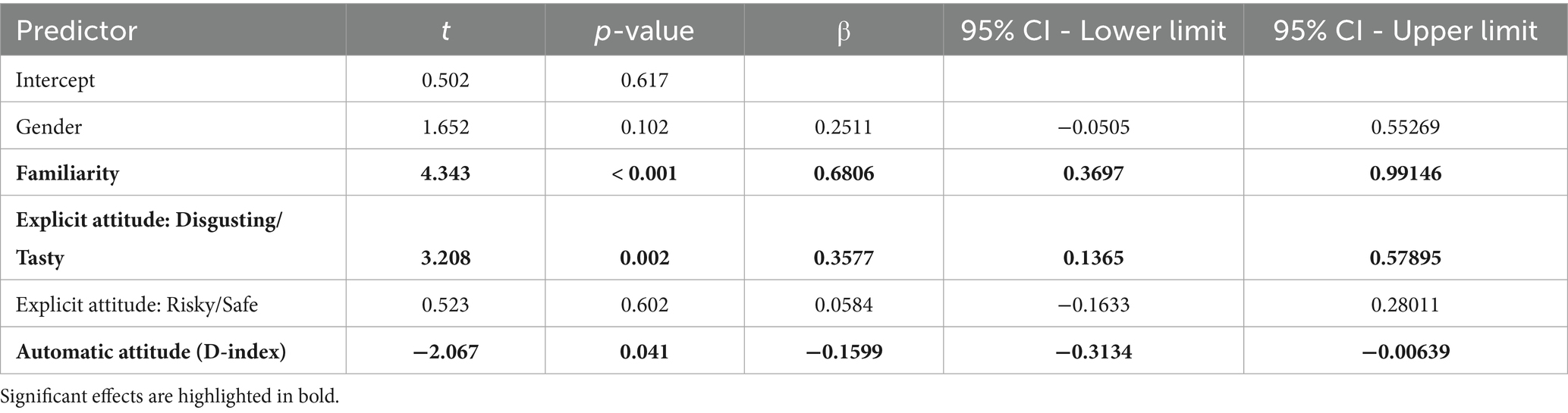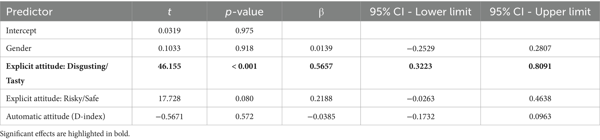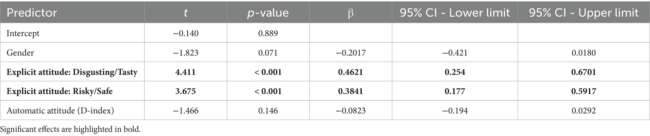 Table 6. Multiple linear impacts of gender, explicit and automatic attitudes on the intention to introduce insect-based food in one’s diet.