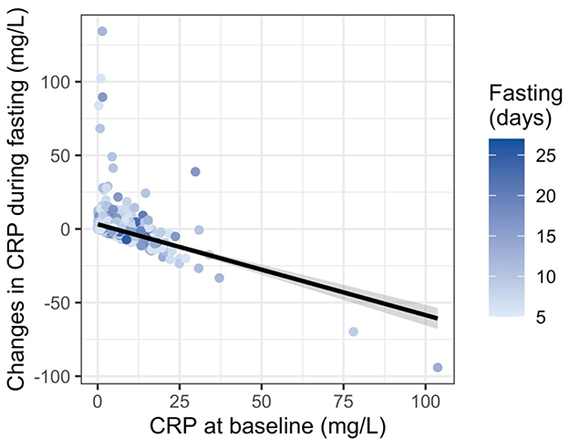 Figure 1. Relationship between baseline CRP levels and changes in CRP during prolonged fasting in 1,422 individuals. Each point represents one individual, with the x-axis showing CRP concentration at baseline and the y-axis indicating the absolute change in CRP by the end of fasting. Point color reflects the duration of the fasting period in days, with darker shades indicating longer fasts. A linear regression line with 95% confidence interval illustrates the overall trend. Individuals with elevated baseline CRP tended to experience a greater reduction in CRP, suggesting a normalization of inflammation during fasting.