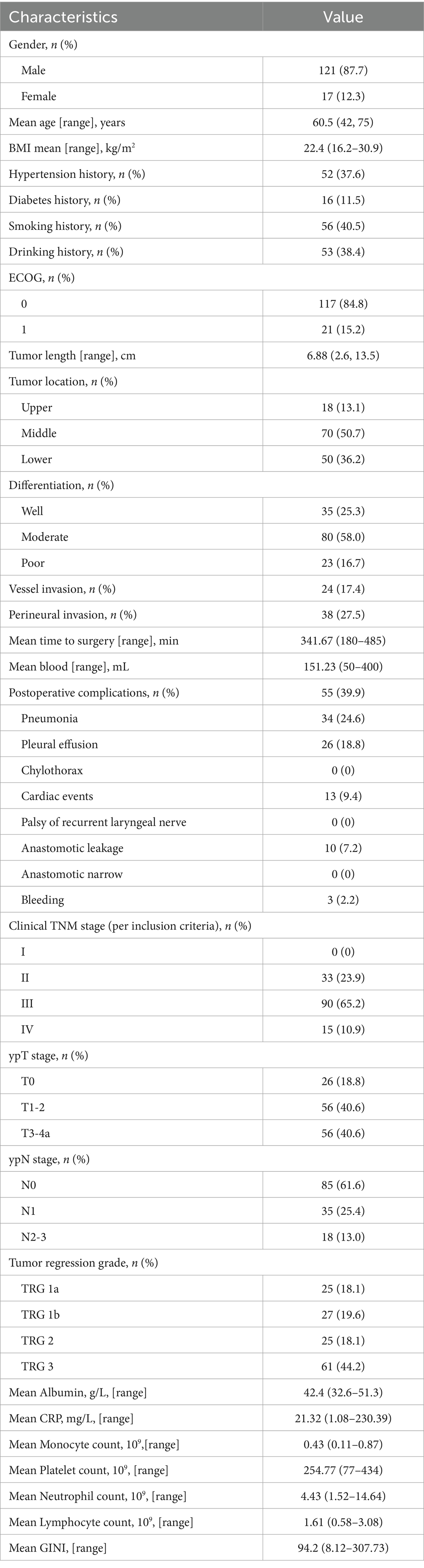 A total of 161 patients with ESCC underwent nICT. Among them, 10 patients refused further treatment, and 13 patients had incomplete clinical data. Therefore, this study retrospectively included 138 patients (Figure 1).