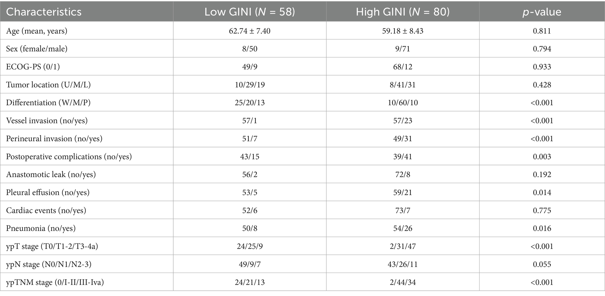 Based on the optimal cutoff value (73.47) determined by the ROC curve, the 138 patients were divided into a low-GINI group (58 patients, 42.0%) and a high-GINI group (80 patients, 58.0%). A comparison of the baseline clinical characteristics between the two groups is shown in Table 3. The high-GINI group showed significantly higher proportions of patients with poor tumor differentiation (p < 0.001), vascular invasion (p < 0.001), perineural invasion (p < 0.001), postoperative pneumonia (p = 0.016), pleural effusion (p = 0.014), as well as more advanced ypT stage (p < 0.001) and ypTNM stage (p < 0.001) compared to the low-GINI group.