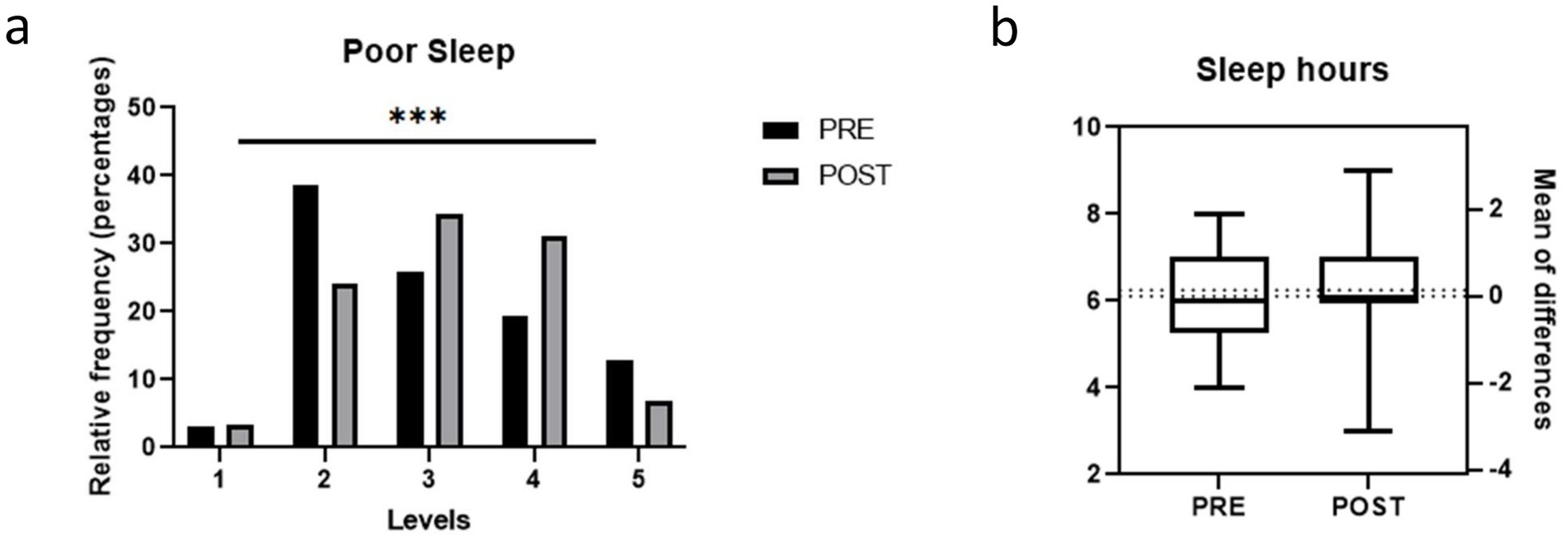After completing the six-month dietary intervention, significant improvements were observed in the participants’ sleep quality, with a significant reduction in the number of nights of poor sleep (χ2 = 60.7; p < 0.001) (Figure 1a). However, no significant changes were observed in total hours slept after the intervention (Figure 1b).