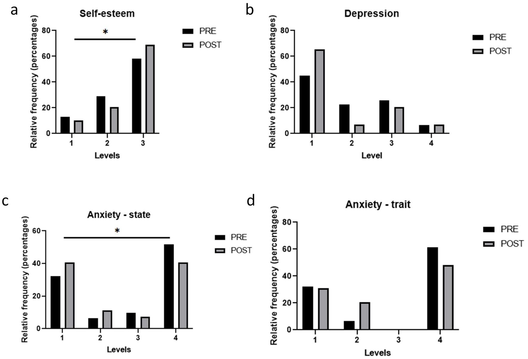 Figure 2. Psychological issues in the study population before and after the weight loss intervention. (a) Levels of Self-Esteem according to the Rosenberg Self-Esteem Scale (1 Low; 2 Moderate; 3 High); (b) Levels of Depression according to the Beck Depression Inventory (BDI-II) (1 Minimal; 2 Mild; 3 Moderate, 4 Severe); (c,d) State and Trait Anxiety according to the State-Trait Anxiety Inventory (STAI) (1 Low; 2 Moderate; 3 High). Bars represent proportions and pre-post comparisons were analyzed by chi-square test.