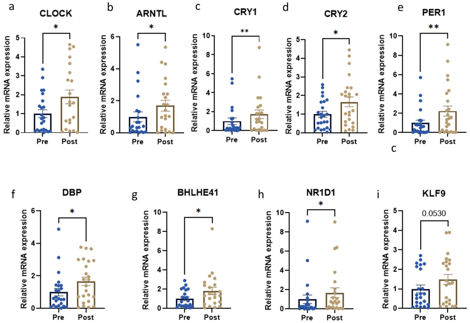We evaluated the expression of key circadian genes in subjects’ PBMCs before and after the dietary intervention. Interestingly, core clock genes were significantly up regulated, namely CLOCK (p < 0.05), ARNTL (p < 0.05), CRY1 (p < 0.01), CRY2 (p < 0.05) and PER1 (p < 0.01) (Figures 3a–e). In addition, the expression levels of the secondary circadian regulated genes were also significantly increased, in particular DBP (p < 0.05), BHLHE41 (p < 0.05) and NR1D1 (p < 0.05) (Figures 3f–h). In contrast, no statistically significant changes were observed for KLF9 after the intervention (p = 0.05) (Figure 3i).