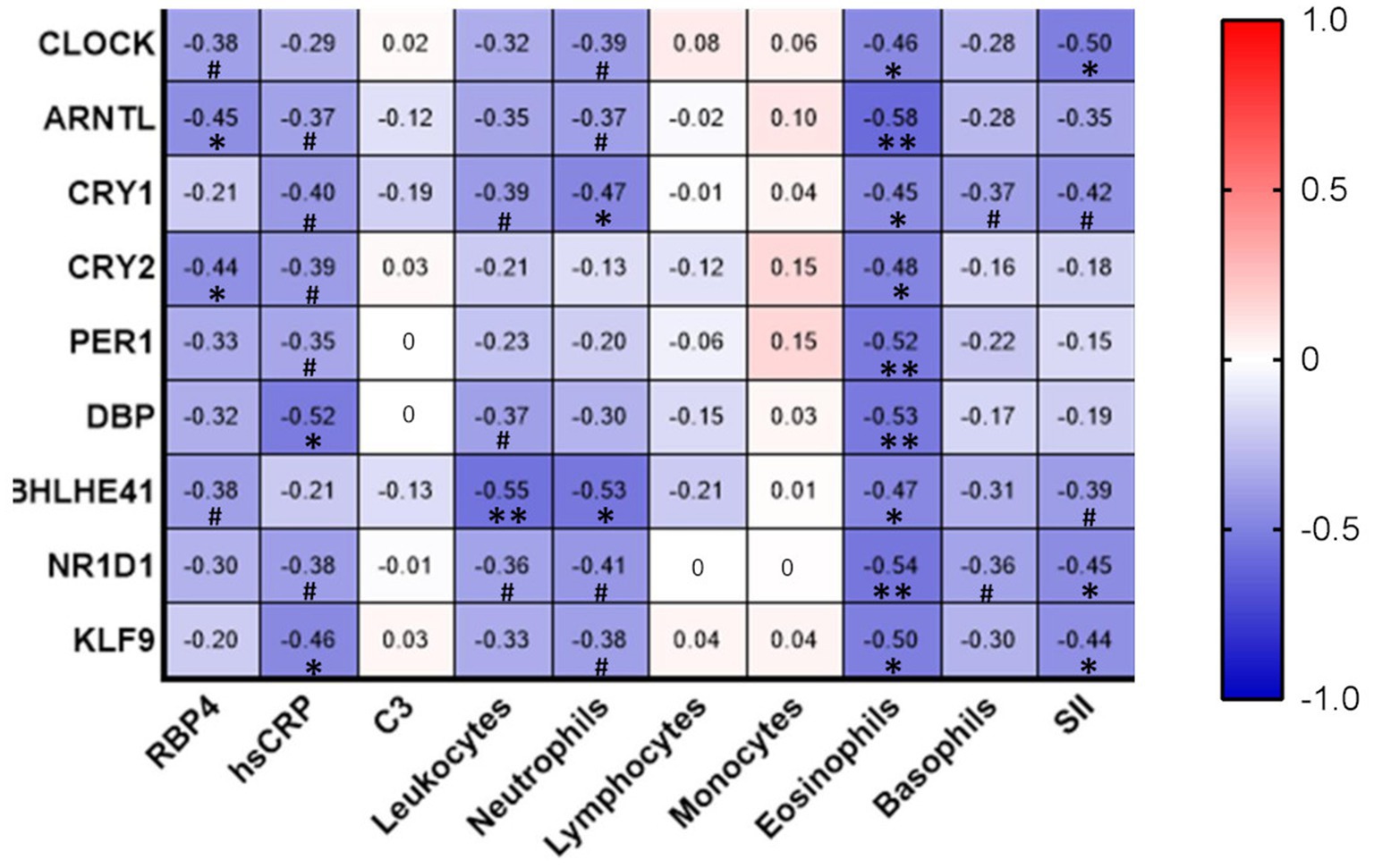 Figure 4. Correlation analysis of circadian gene expression and inflammation-related parameters. Correlations between variables were analyzed using Spearman’s Rho bivariate correlation. *p < 0.05; **p < 0.01;·# between p > 0.05 and p < 0.10. C3, complement component 3; hs-CRP, high-sensitivity C-reactive protein; RBP4, Retinol Binding Protein 4; SII, systemic immune-inflammation index (SII = platelet × neutrophil/lymphocyte ratio).