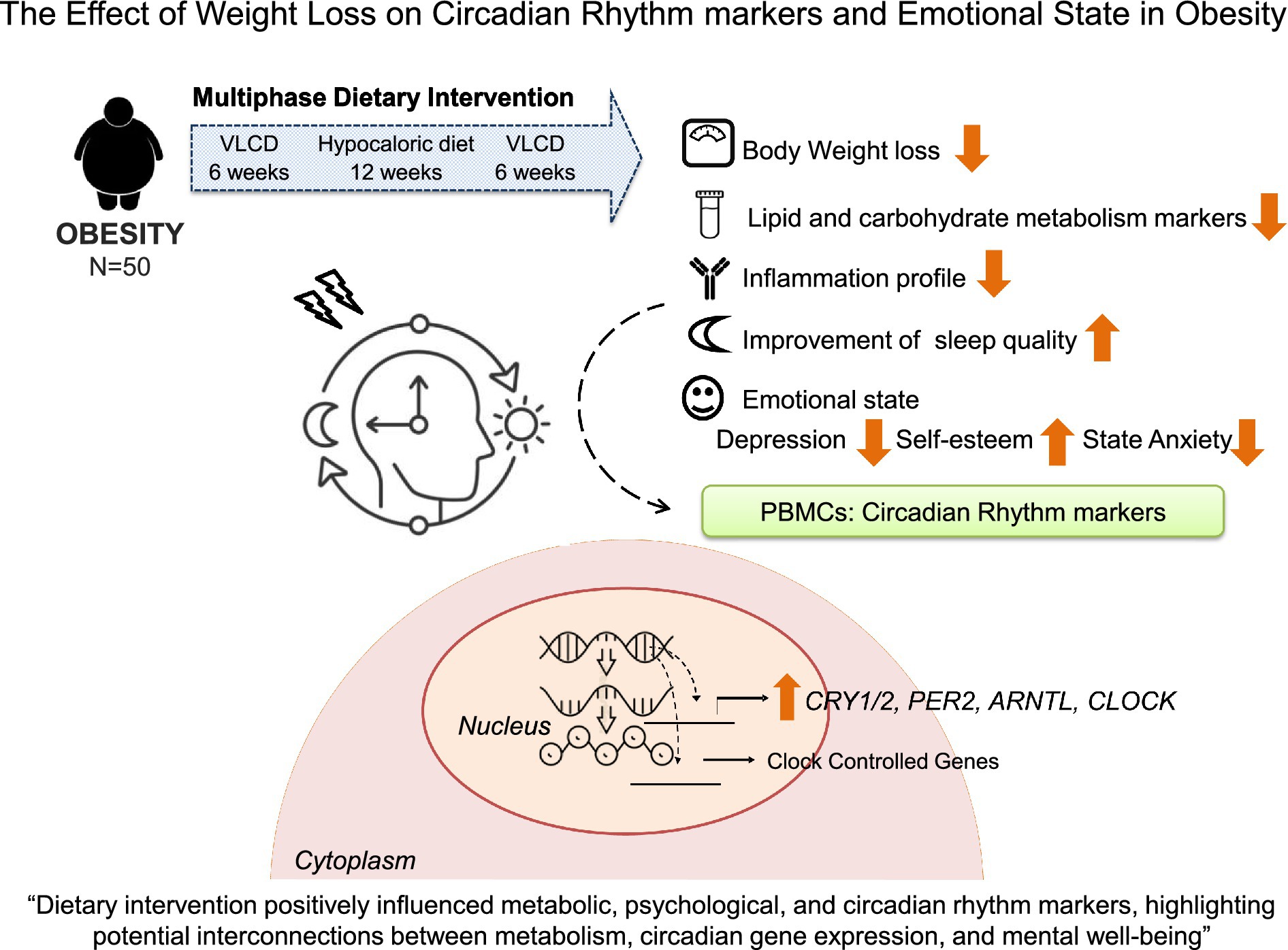 This study explores the relationship between weight loss, circadian gene expression regulation, and emotional well-being in the context of obesity. Our results show that subjects who followed a six-month dietary intervention experienced a significant reduction in body weight, accompanied by improvements in metabolic parameters and a widespread decrease in inflammatory markers. At the molecular level, an upregulation of key circadian clock genes was evident in PBMCs, and was associated with improved psychological and metabolic markers. Furthermore, significant negative correlations were identified between the expression of circadian genes and various inflammatory markers, suggesting that diet modulates not only metabolism and emotional state but also the expression of molecular clock related genes and systemic inflammation. These findings underscore the importance of a holistic approach to addressing the complex interplay between metabolic and psychological factors in obesity management.