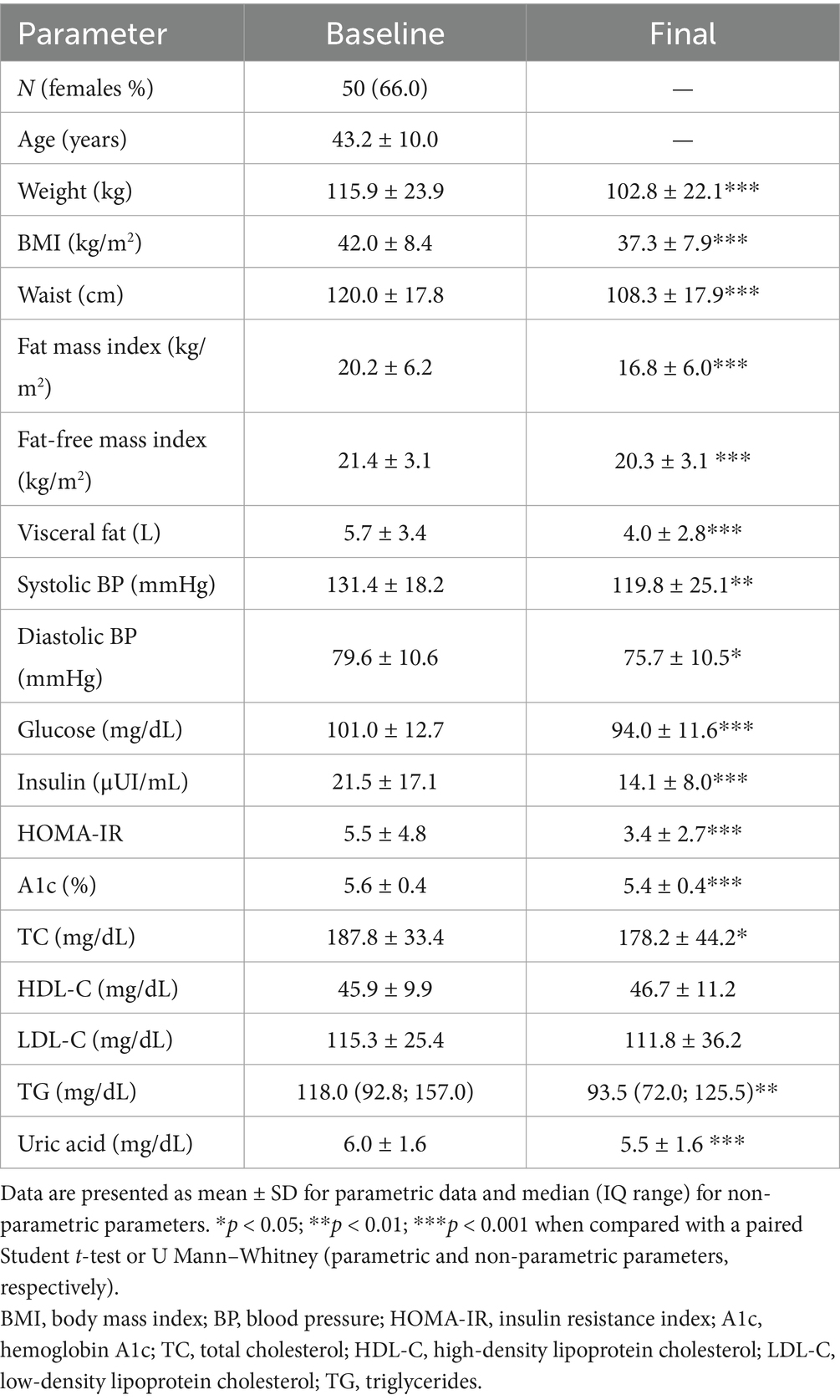 This study included 50 individuals, 66% of whom were female, with an average age of 43.2 ± 10.0 years and a mean BMI of 42.0 ± 8.4 kg/m2. A total of 35% had been diagnosed with hypertension, 6% with type 2 diabetes, and 20% had dyslipidemia. At baseline, metabolic syndrome was confirmed in 58% of the participants and 22% presented sleep apnea. Additionally, three participants reported daily pharmacological treatment with anxiolytic medication, which had been maintained stable for at least 3 months prior to study inclusion.