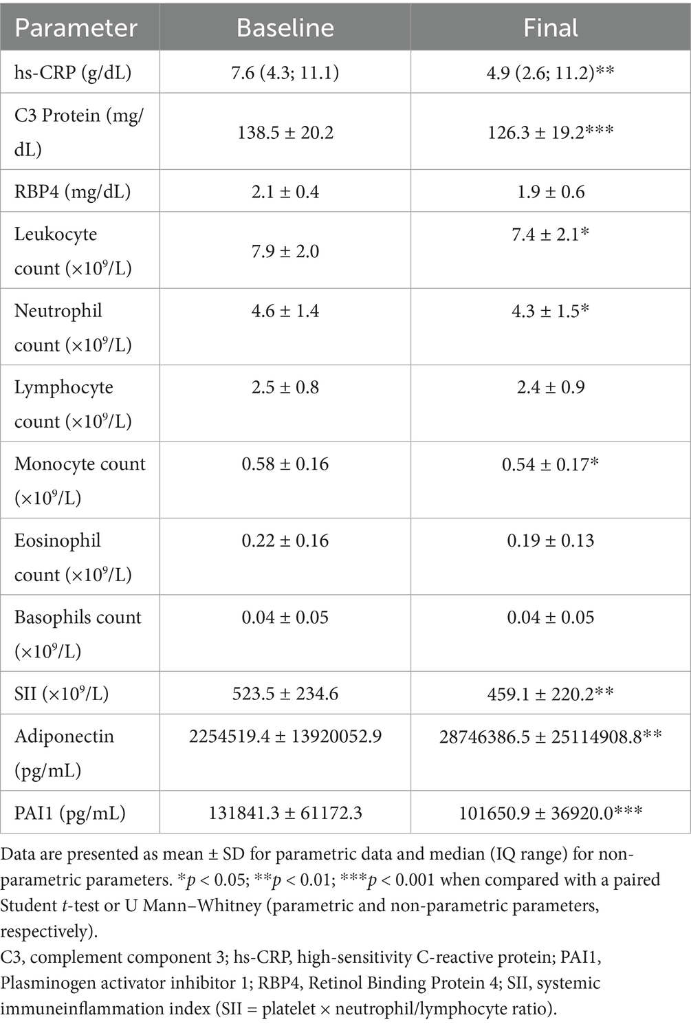 Following the dietary intervention, 72% successfully achieved the weight loss goal. Specifically, subjects experienced an average weight reduction of 11.1 ± 8.1%, accompanied by significant reductions in fat mass (10.7 ± 11.1 Kg) and visceral fat volume (1.7 ± 1.6 L). Furthermore, a substantial decrease was observed in both systolic and diastolic BP, along with notable improvements in lipid (total cholesterol; TC and triglycerides; TG) and carbohydrate metabolism (glucose, insulin, HOMA-IR, hemoglobin A1c) and adiponectin (Table 1). Moreover, there were reductions in several inflammatory markers, such as acid uric, high-sensitivy c-reactive protein (hs-CRP), C3 protein (C3), neutrophil and monocyte count, and plasminogen activator inhibitor 1 (PAI-1), indicating an overall amelioration of the subjects’ inflammatory and metabolic profile (Table 2).