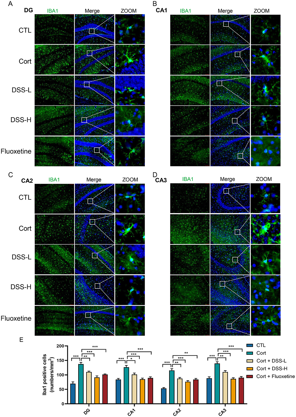Figure 5. DSS suppresses hippocampal neuroinflammation in mice. (A) Staining using coronal section of mouse, representative images labeled with IBA1 was shown in the dentate gyrus (DG) region of the mice's hippocampus. (B) Representative images of IBA1 labeling in the CA1 region of the mouse hippocampus. (C) Representative images of IBA1 labeling in the CA2 region of the mouse hippocampus. (D) Representative images of IBA1 labeling in the CA3 region of the mouse hippocampus. (E) Quantification of microglia labeled with IBA1 in the mouse hippocampus. Data are expressed as Mean ± SEM, n = 3, *P < 0.05, **P < 0.01, ***P < 0.001.