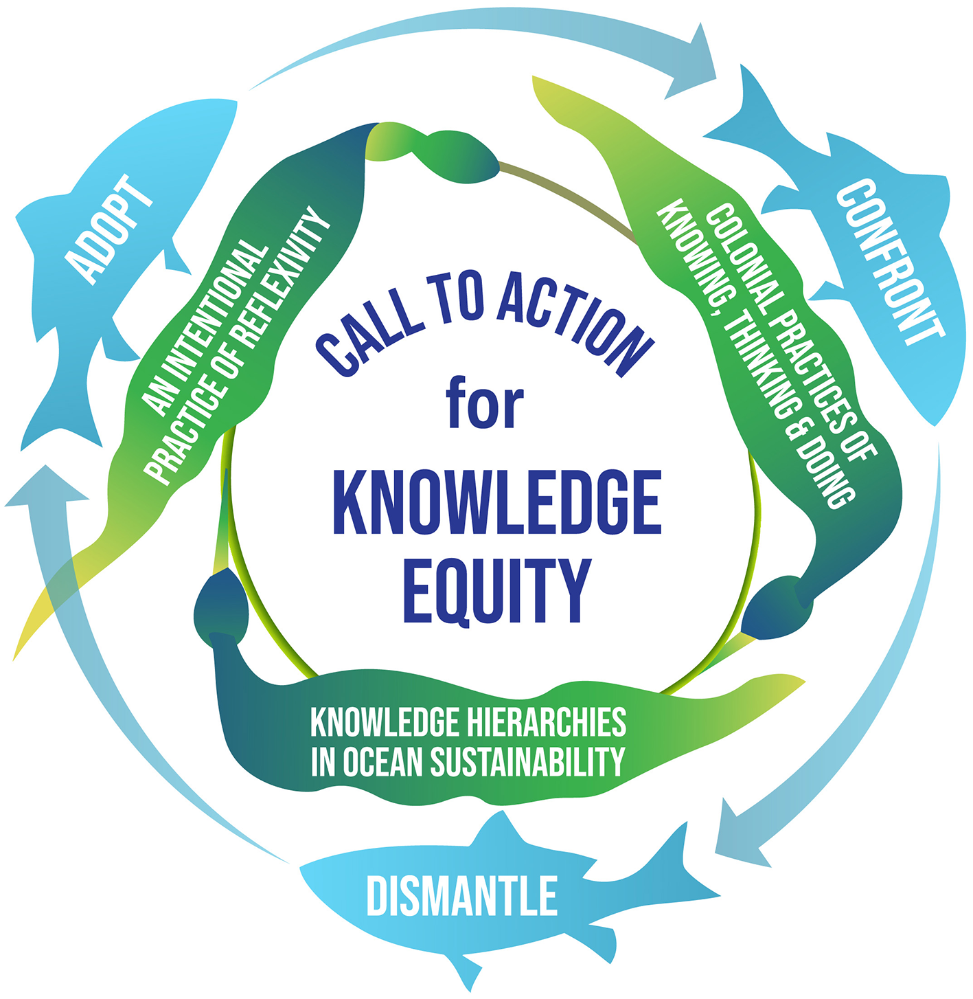 We begin our perspective piece by sharing our understanding of knowledge equity and reflecting on how the reliance on western science as the dominant knowledge production system has hindered the world's ability to sustain a healthy and productive ocean. Next, we share our perspective on the importance of knowledge equity for strengthening ocean sustainability and as a pathway for redressing historical injustices. We conclude with a call to action to ensure that knowledge equity is embedded as a principle and a practice within the Ocean Decade framework and beyond (Figure 1). We invite all ocean professionals—including scientists, ECRs, and practitioners—to join us in: (1) adopting an intentional practice of reflexivity in our work; (2) confronting colonial ways of thinking, knowing, and doing; and (3) dismantling knowledge hierarchies that permeate ocean science and practice.